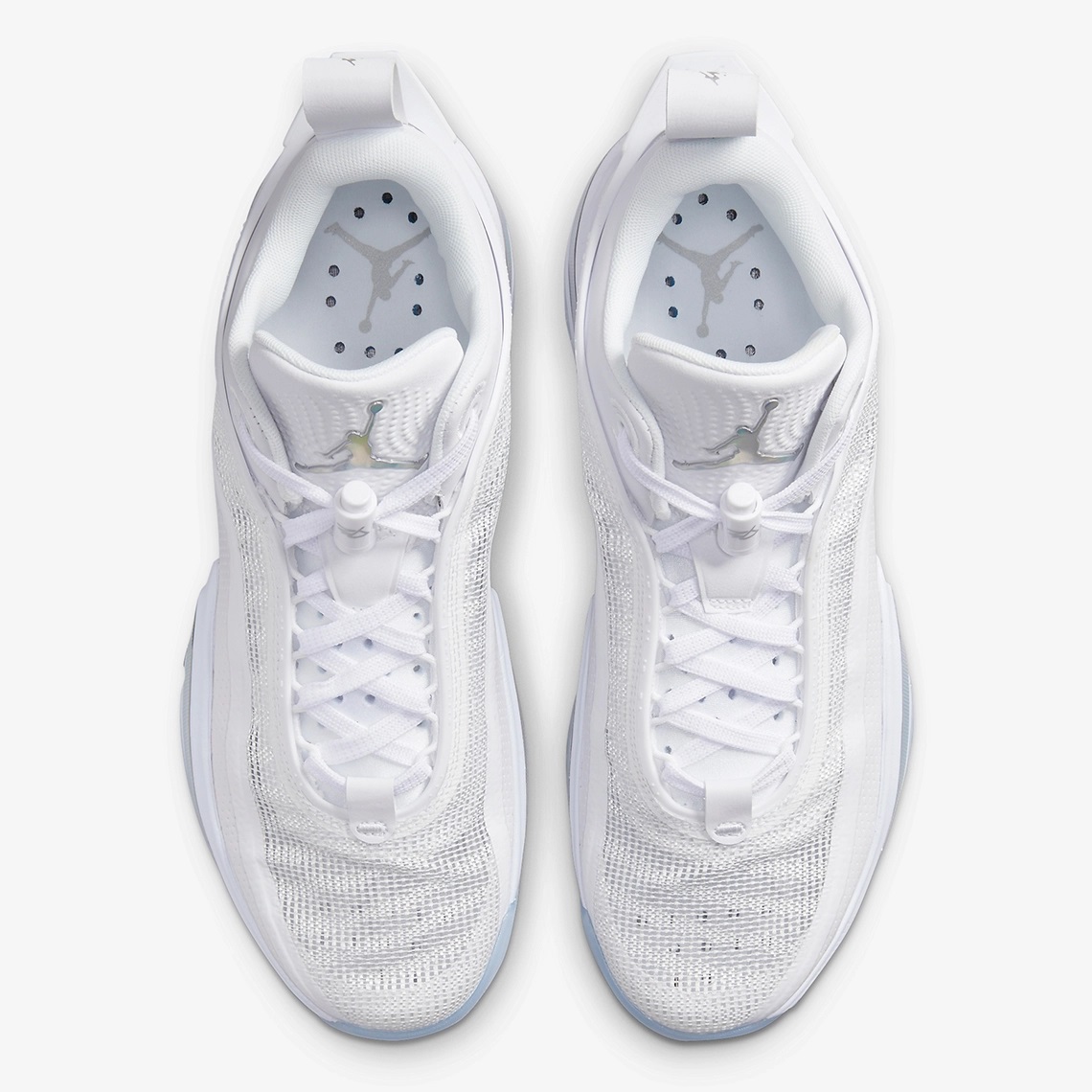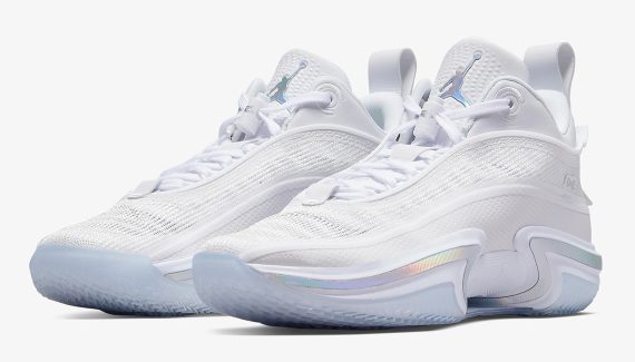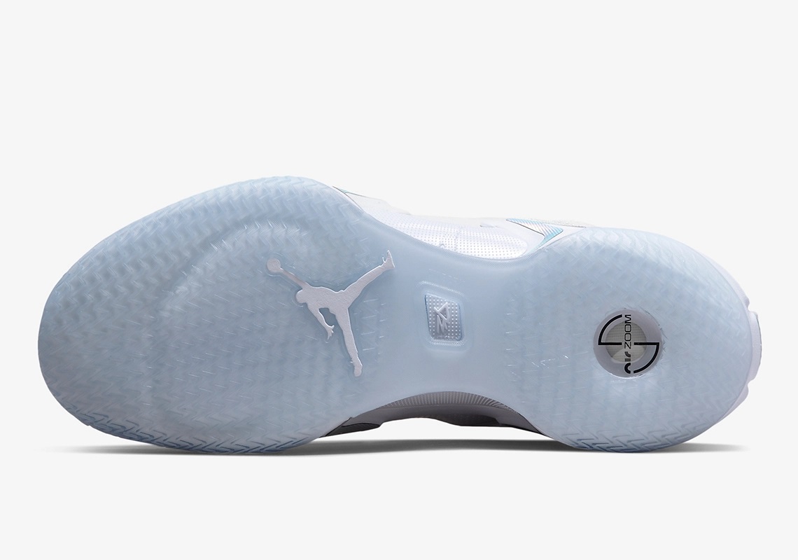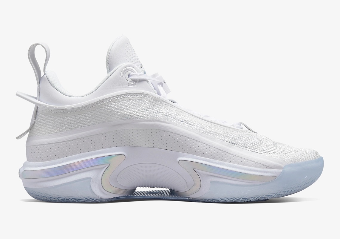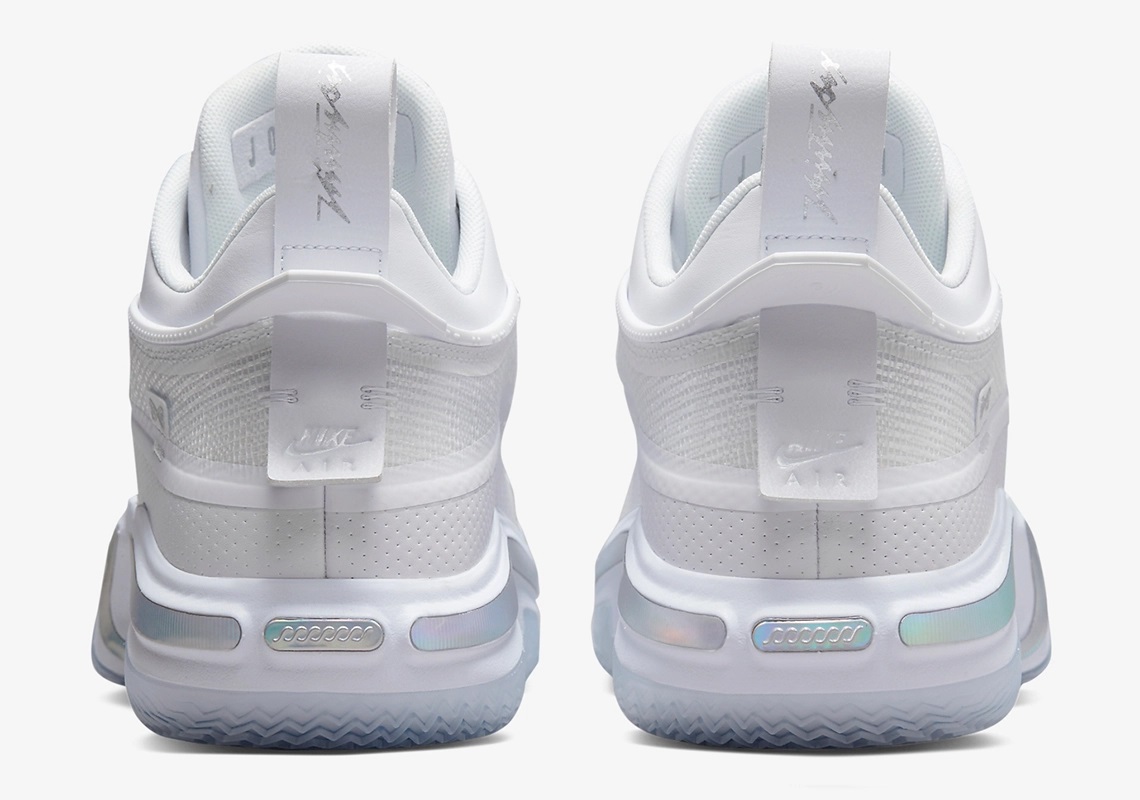 La tige est entièrement blanche. La subtilité de ce modèle se trouve dans ses finitions « argentées », sur le bandeau traversant la semelle intermédiaire et le logo « Jumpman », donnant un petit côté « arc-en-ciel » à la paire. La semelle extérieure est en caoutchouc « glacé ».