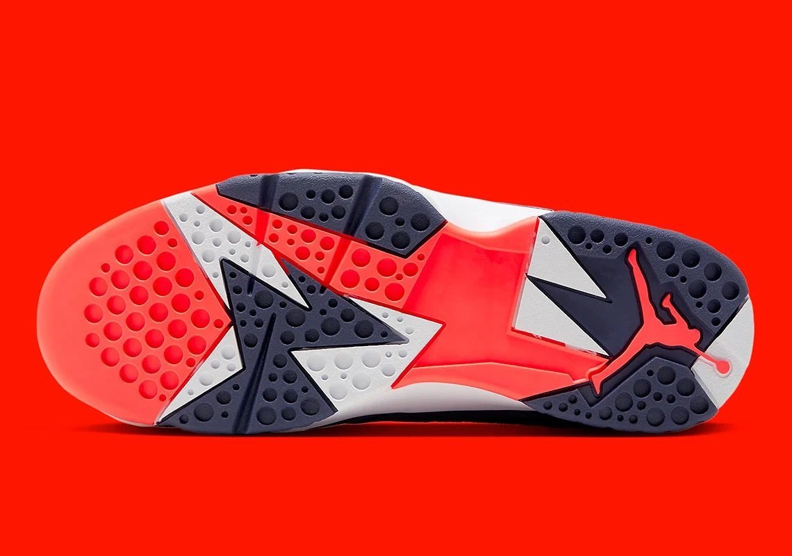 Déjà aperçue furtivement, celle-ci comprendra une Air Jordan 1 Stash, une Luka 1, et une Air Jordan 7, dévoilée ci-dessous. La tige en daim recouverte de bandes en nubuck est essentiellement en bleu marine. Le modèle est rehaussé par des touches de rouge-orange, sur le « Jumpman », ou l’inscription « Jordan » sur la languette. Le « Quai 54 » apparaît en blanc sur la tirette.