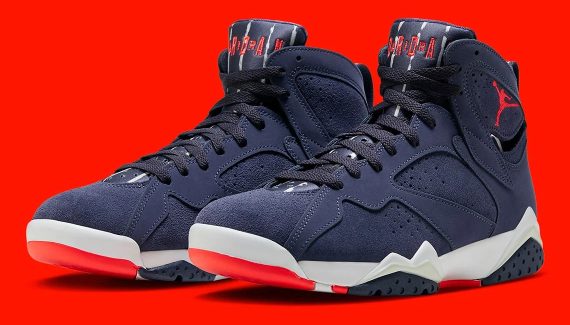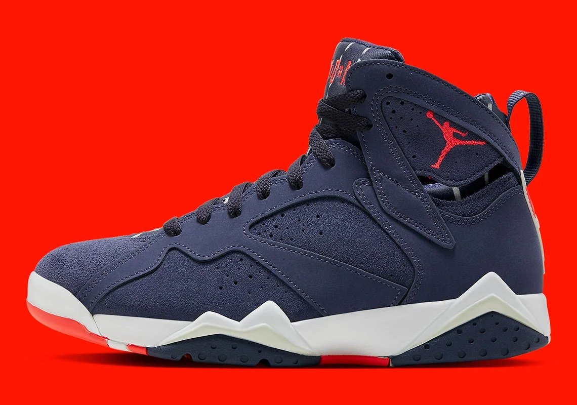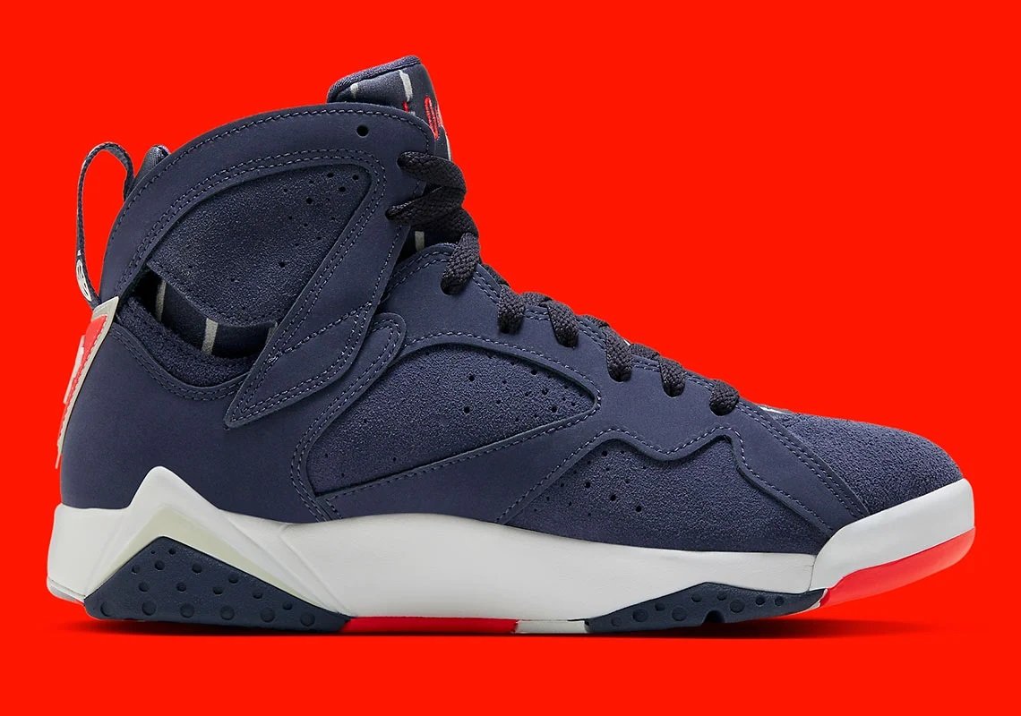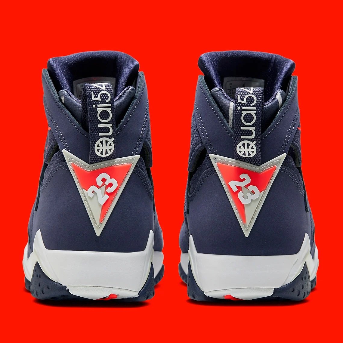 Déjà aperçue furtivement, celle-ci comprendra une Air Jordan 1 Stash, une Luka 1, et une Air Jordan 7, dévoilée ci-dessous. La tige en daim recouverte de bandes en nubuck est essentiellement en bleu marine. Le modèle est rehaussé par des touches de rouge-orange, sur le « Jumpman », ou l’inscription « Jordan » sur la languette. Le « Quai 54 » apparaît en blanc sur la tirette.