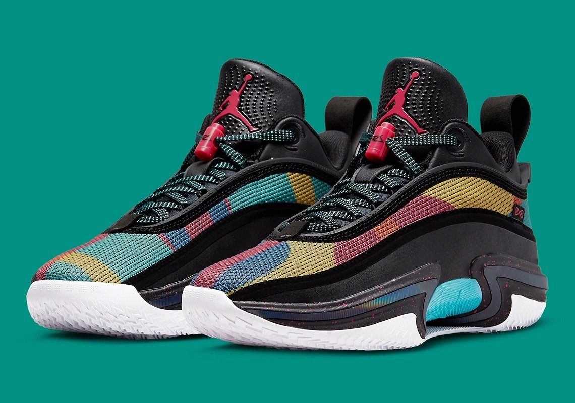 La Air Jordan 36 Low est de retour sur le devant de la scène en attendant la sortie de la Air Jordan 37. Ce nouveau coloris prend le contre-pied du précédent, entièrement blanc, avec cette fois une tige noire assortie d’une bande multicolore composée de rouge, jaune, orange, bleu et de vert.