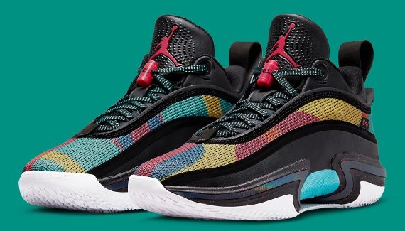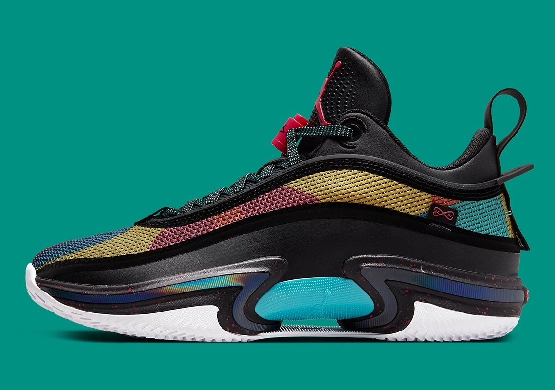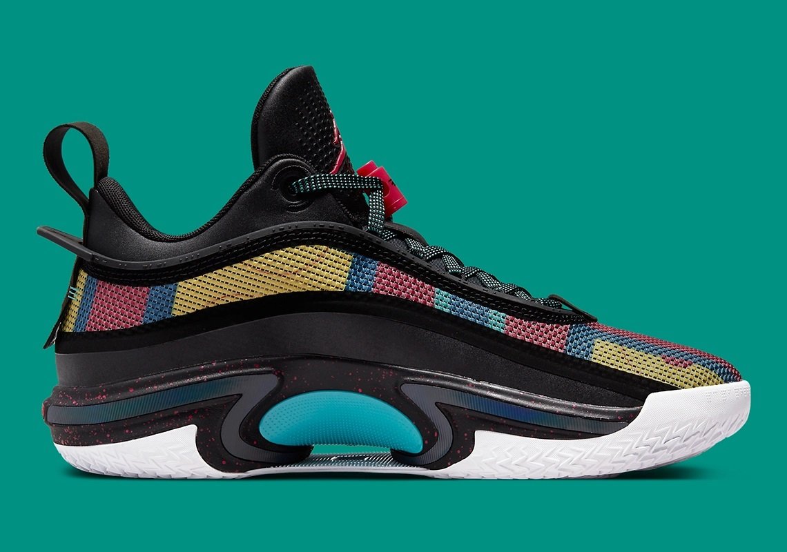 La Air Jordan 36 Low est de retour sur le devant de la scène en attendant la sortie de la Air Jordan 37. Ce nouveau coloris prend le contre-pied du précédent, entièrement blanc, avec cette fois une tige noire assortie d’une bande multicolore composée de rouge, jaune, orange, bleu et de vert.