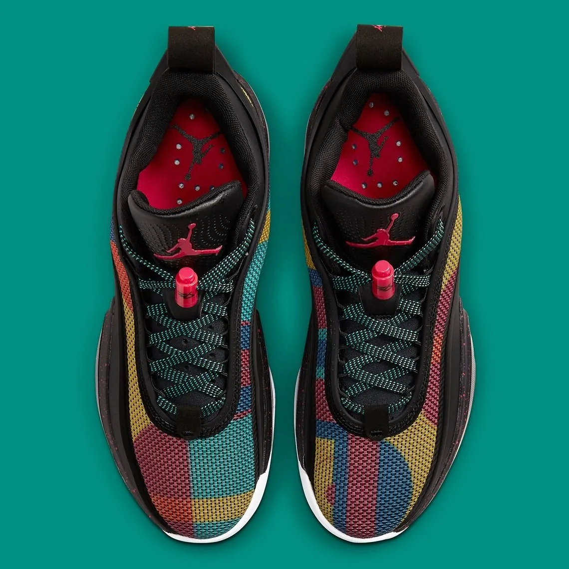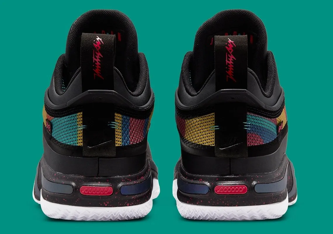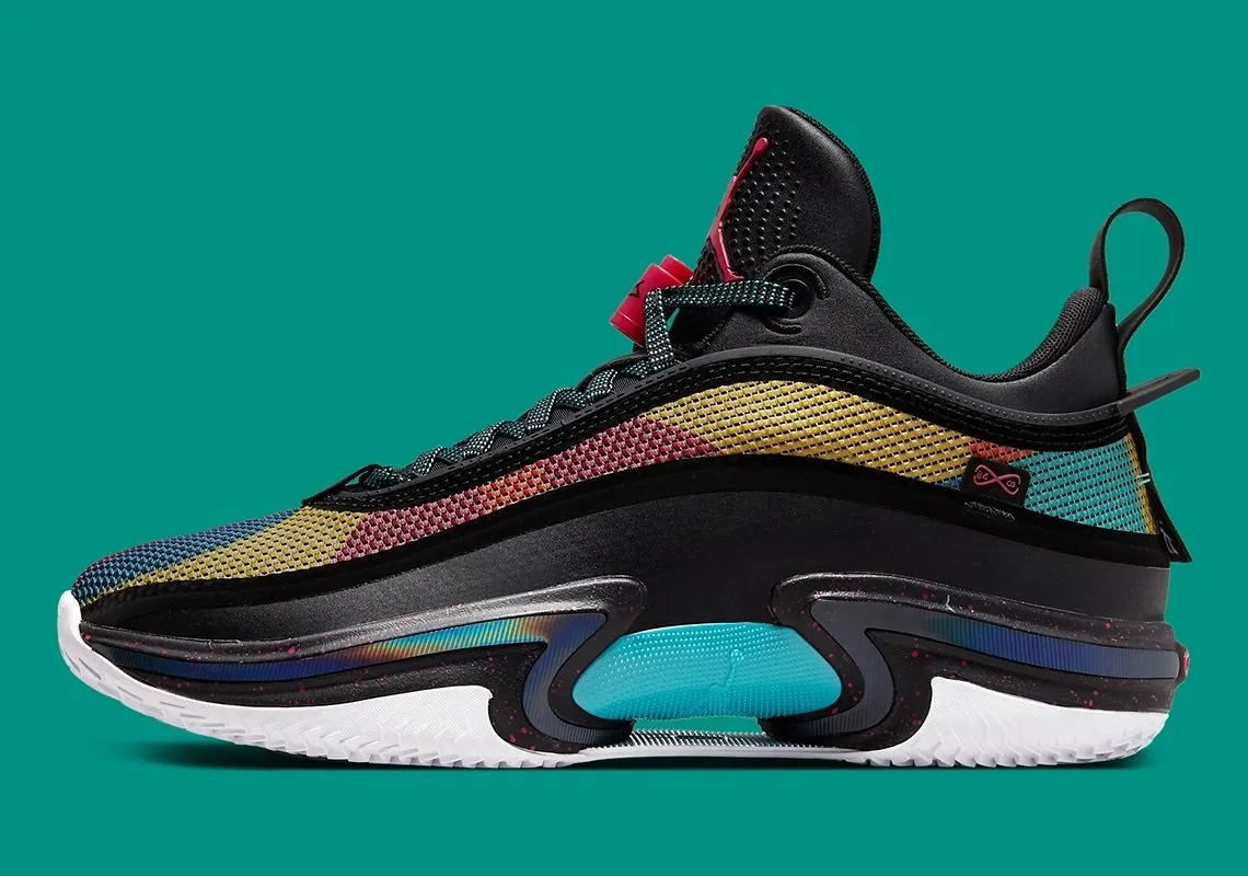La Air Jordan 36 Low est de retour sur le devant de la scène en attendant la sortie de la Air Jordan 37. Ce nouveau coloris prend le contre-pied du précédent, entièrement blanc, avec cette fois une tige noire assortie d'une bande multicolore composée de rouge, jaune, orange, bleu et de vert.
