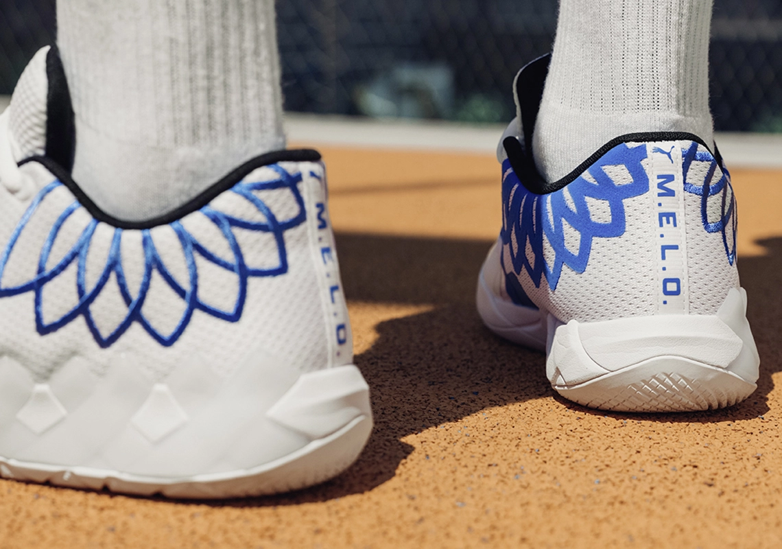 Le blanc domine sur la majorité de chacun des trois tiges, et deux d’entre elles se distinguent donc par des finitions en bleu sur la première, rouge sur la deuxième, notamment au niveau de la flamme à la base de la cheville, censée poursuivre le tatouage de fusée du joueur lorsqu’il porte sa chaussure signature.
