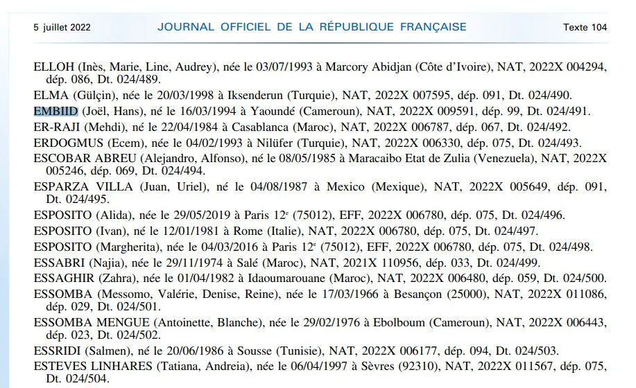 C'est écrit noir sur blanc au Journal officiel : depuis le 5 juillet 2022, Joel Embiid est naturalisé français ! Evasif sur la question lorsqu'il était interrogé, le pivot des Sixers est donc allé au bout de la démarche, et il peut donc désormais prétendre à une sélection en Equipe de France.