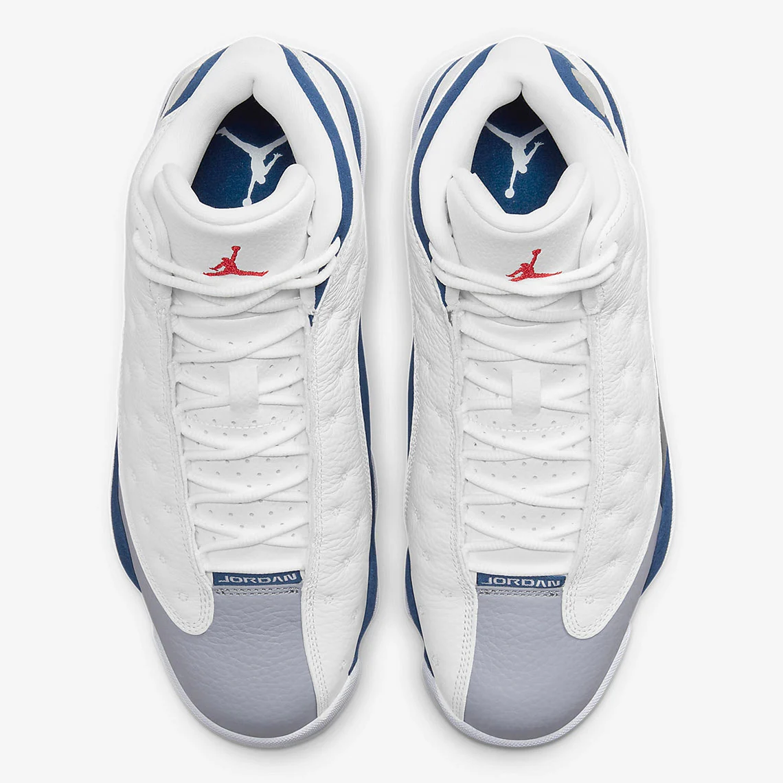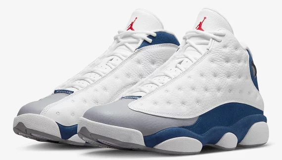Du bleu, du blanc et du rouge (et un peu de gris), tel est le code couleur choisi par Jordan Brand pour habiller sa dernière Air Jordan 13 baptisée « French Blue ». Avec donc du cuir « grenaillé » en blanc sur l’empeigne, une légère note de gris à l’avant de la tige et ce fameux bleu marine « français » recouvrant la partie en daim partant de la base du modèle et remontant vers le talon.