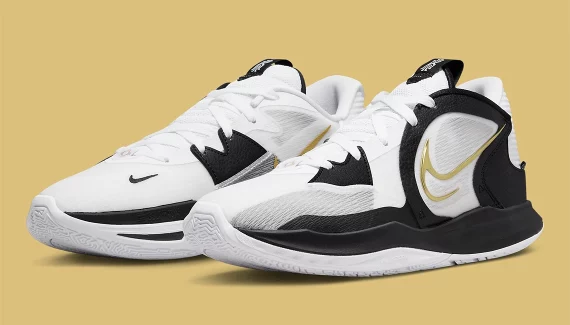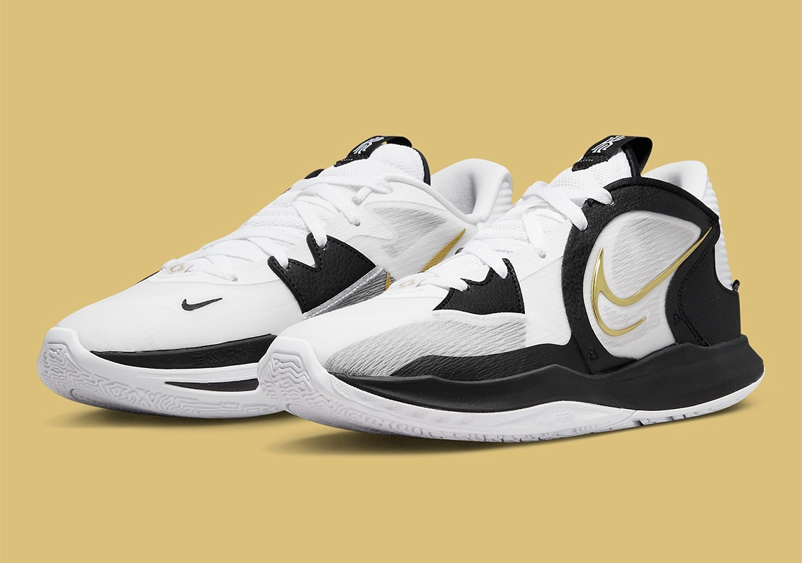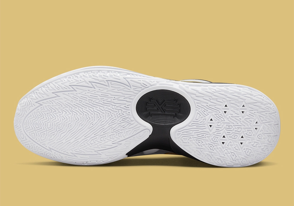 Au-delà de la languette également blanche et noir, le modèle se distingue surtout par ses virgules aux contours dorées sur l’empeigne, soit de la même couleur que le trophée Larry O’Brien sacrant le champion de la NBA chaque année. A voir si Kyrie Irving sera sur la liste des lauréats en 2023. Et ce ne sera pas forcément à Brooklyn.