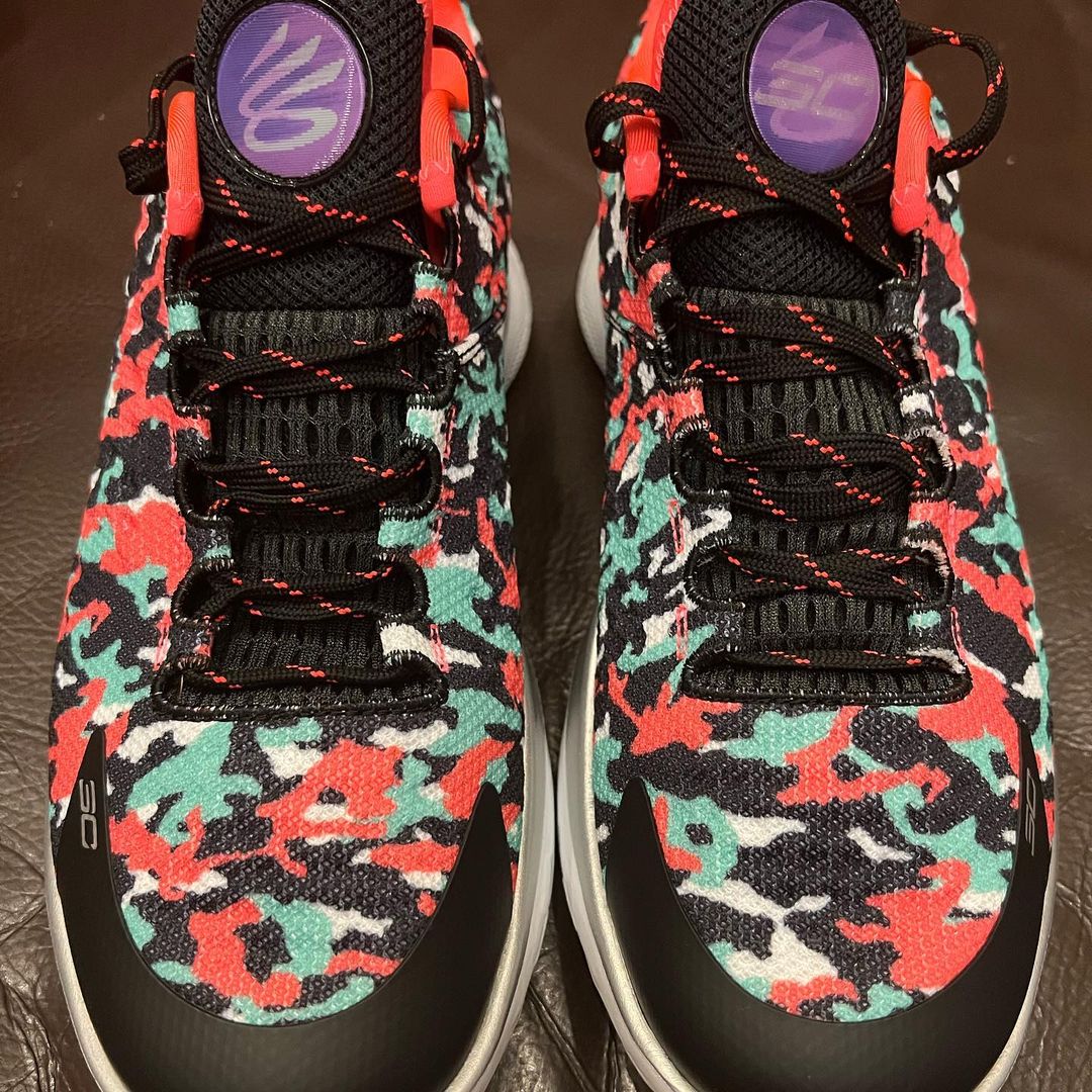 La tige en mesh AnaFoam est cette fois habillée d’un coloris camouflage en noir, vert et rouge. On retrouve également l’ancien logo « SC30 » en gris métallisé au niveau du talon.