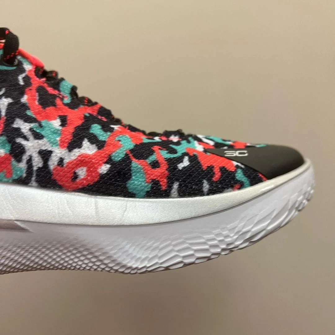 La tige en mesh AnaFoam est cette fois habillée d’un coloris camouflage en noir, vert et rouge. On retrouve également l’ancien logo « SC30 » en gris métallisé au niveau du talon.