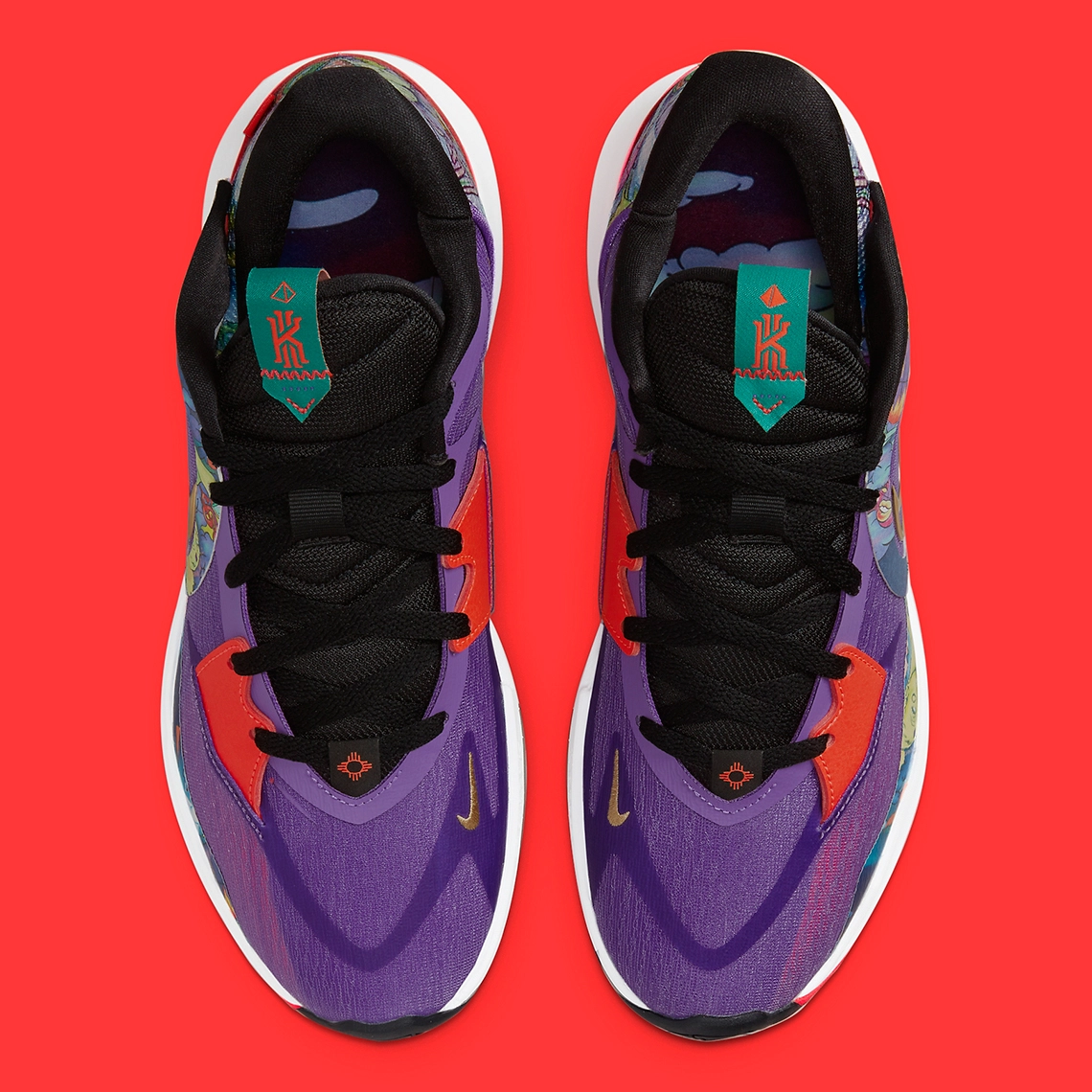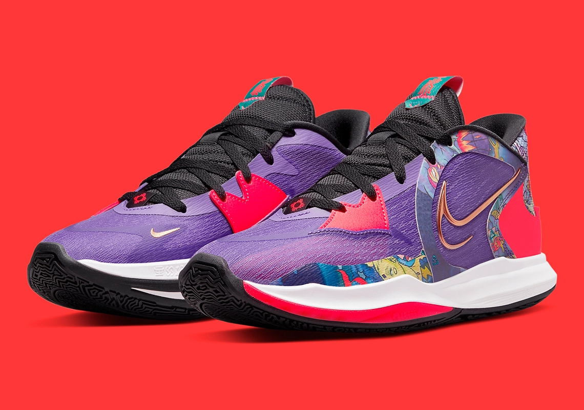 Nike avait promis huit nouveaux coloris en 2022 pour la Kyrie 5 Low. On arrive donc tranquillement au bout avec cette nouvelle version « Purple », à la tige principalement en violet et assortie de touches de rouge.