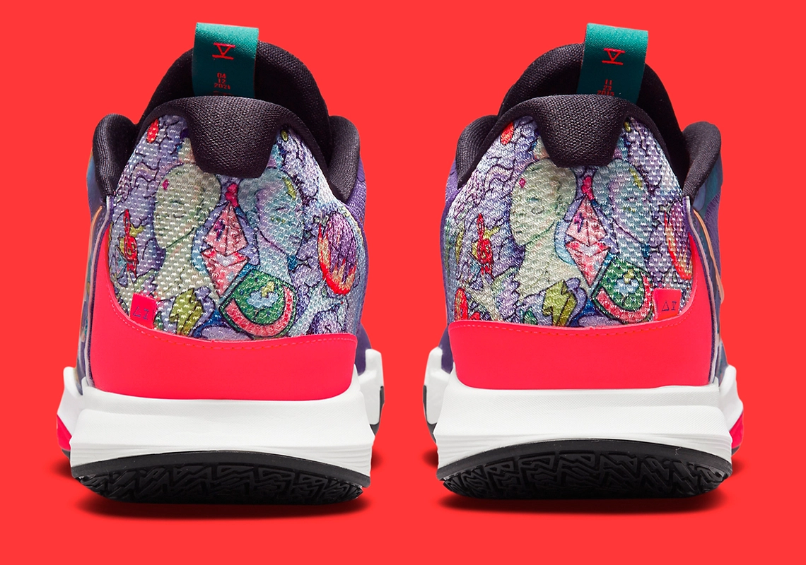 Mais ce qui attire le plus l’œil se situe au niveau du talon où ressortent des motifs censés représenter le basket, la mode et la musique. On retrouve la même illustration sur la semelle intérieure, avec notamment les inscriptions « Create Forever » et « Be Epic ». La date de sortie de cette Kyrie 5 Low n’est pas encore connue.