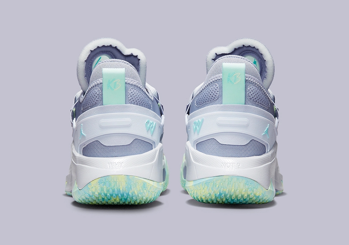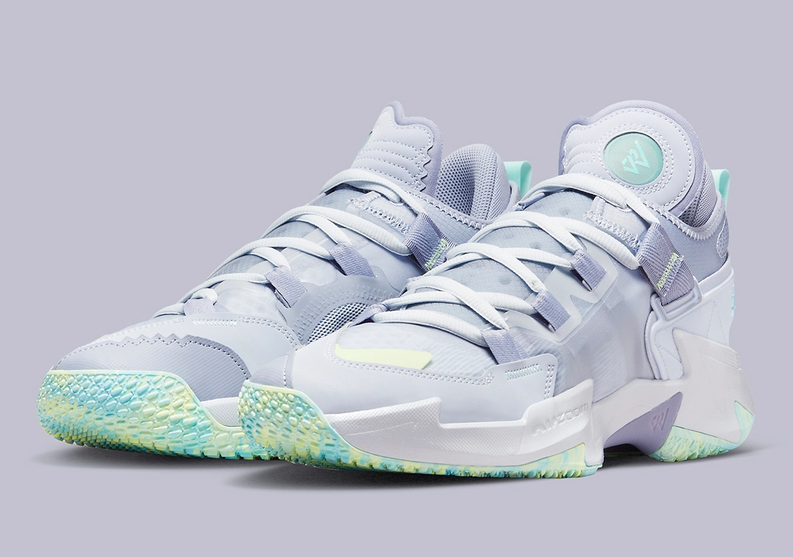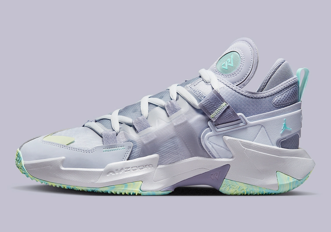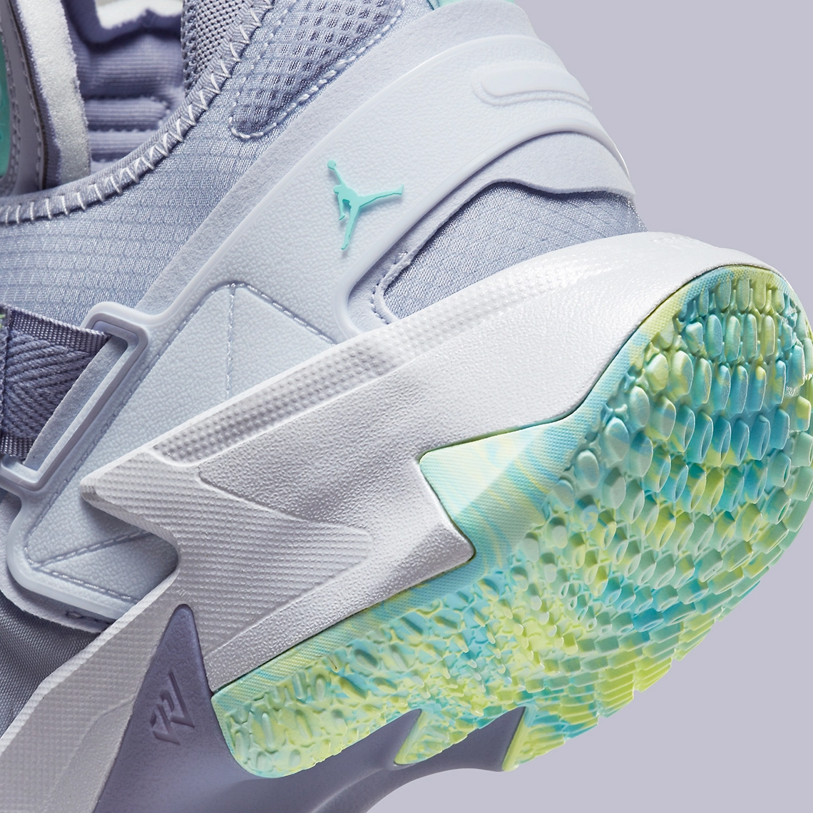 L’ensemble est complété de note de bleu turquoise, pour faire ressortir le « Jumpman » sur le talon, le logo « RW » sur la languette ou la tirette. On note aussi la présence d’une bande entre vert et jaune pâle à l’avant de la chaussure. On retrouve ce trio jaune-vert-bleu clair au niveau de la semelle extérieure.