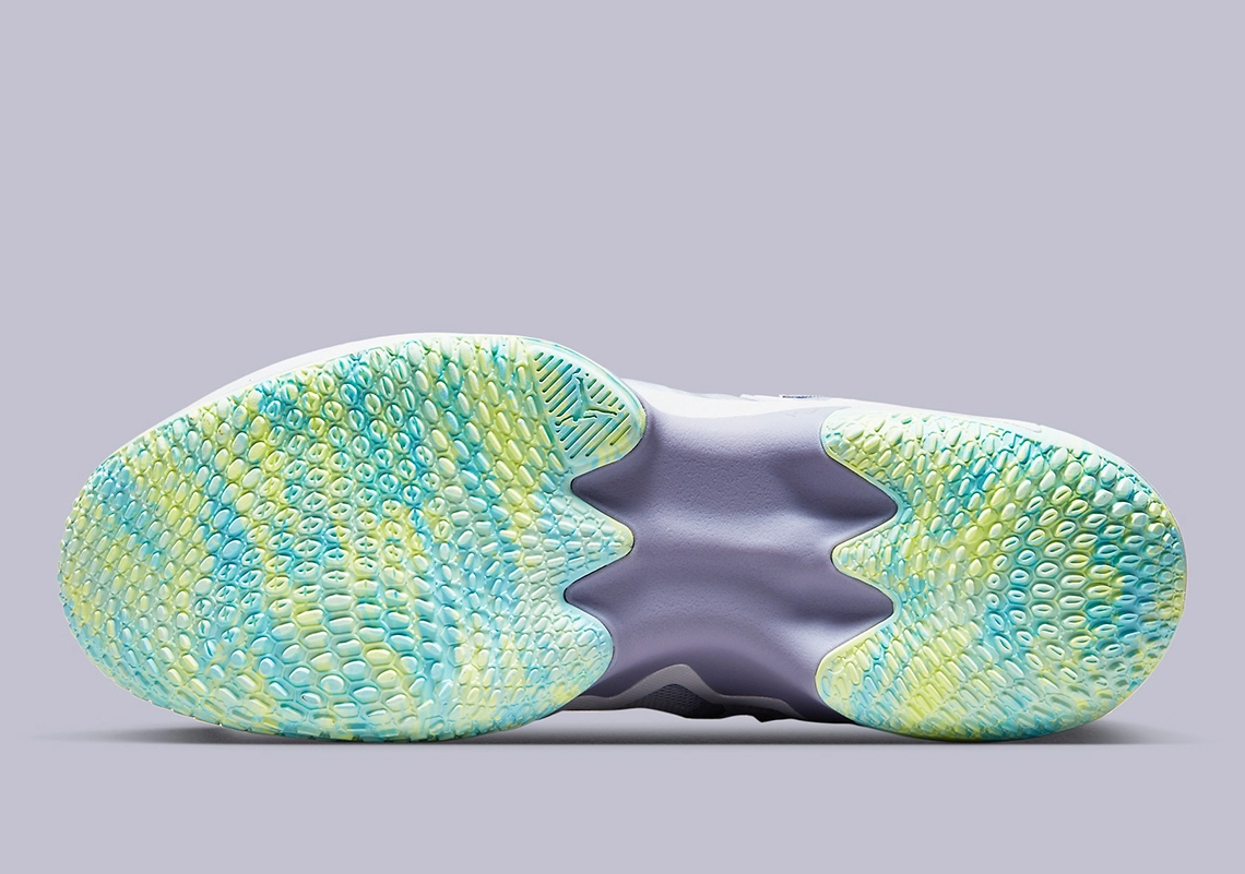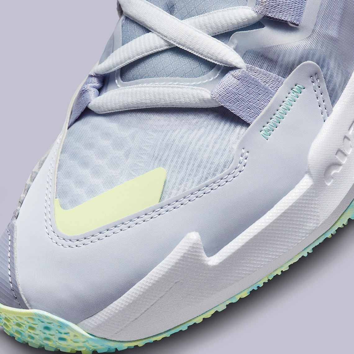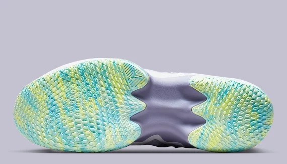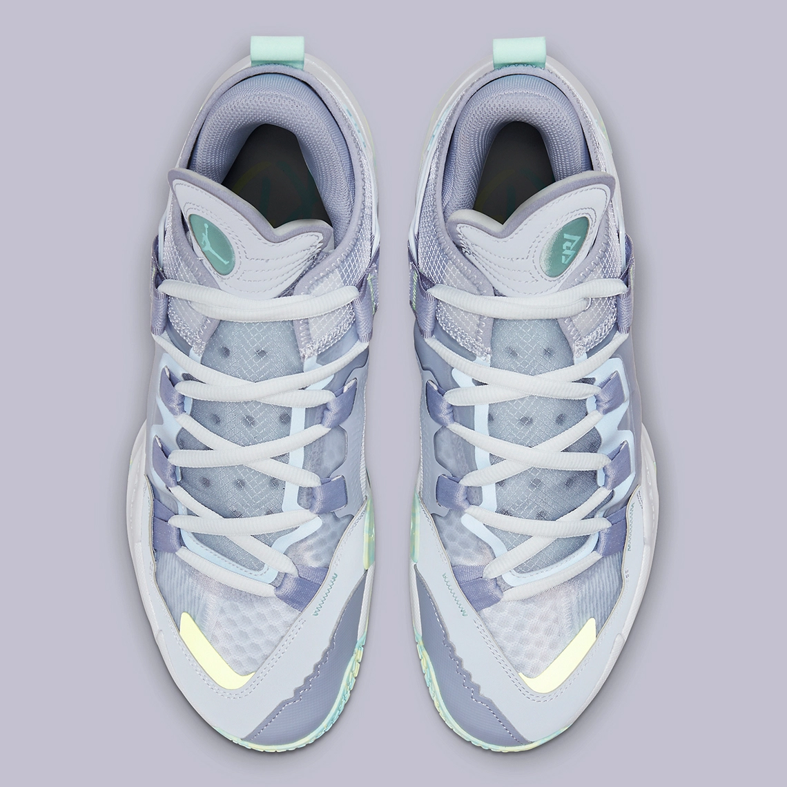 L’ensemble est complété de note de bleu turquoise, pour faire ressortir le « Jumpman » sur le talon, le logo « RW » sur la languette ou la tirette. On note aussi la présence d’une bande entre vert et jaune pâle à l’avant de la chaussure. On retrouve ce trio jaune-vert-bleu clair au niveau de la semelle extérieure.