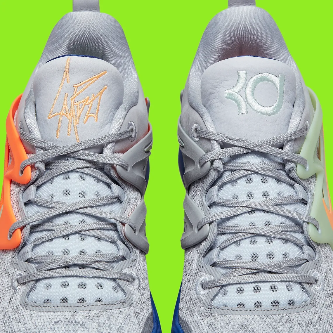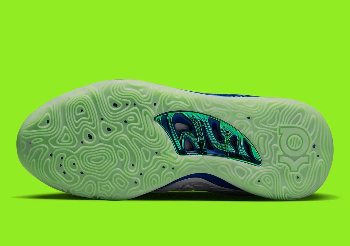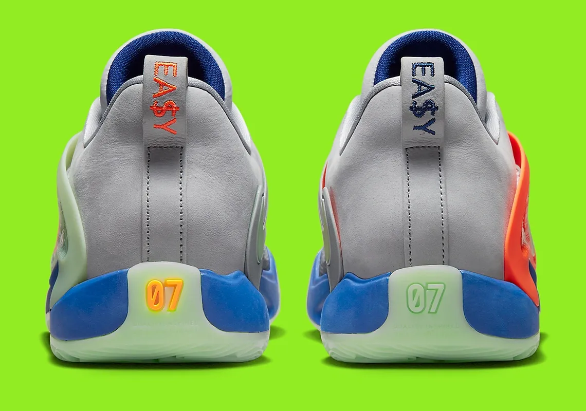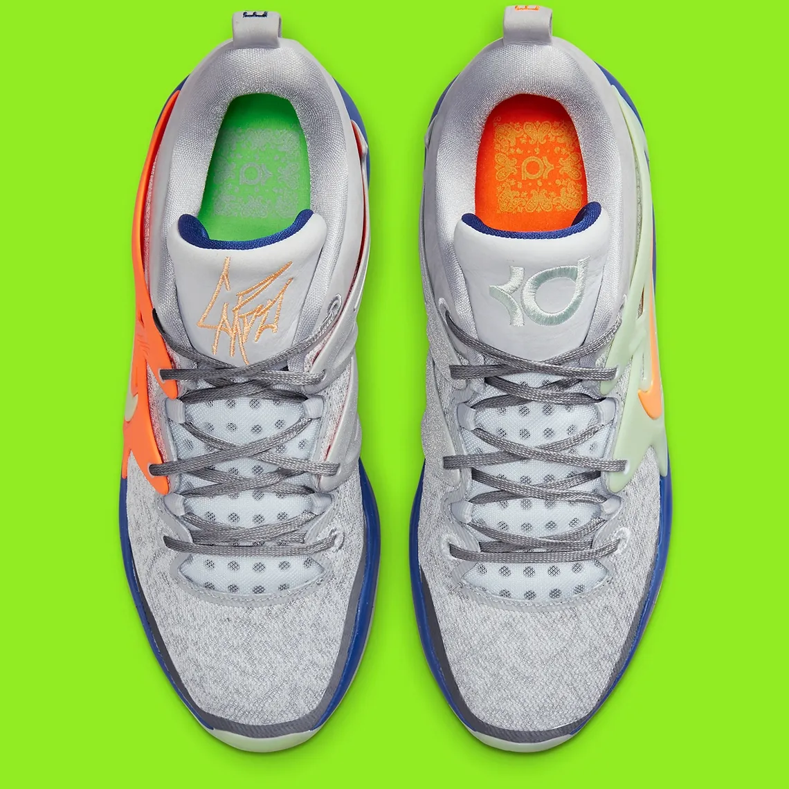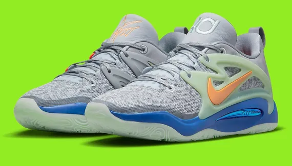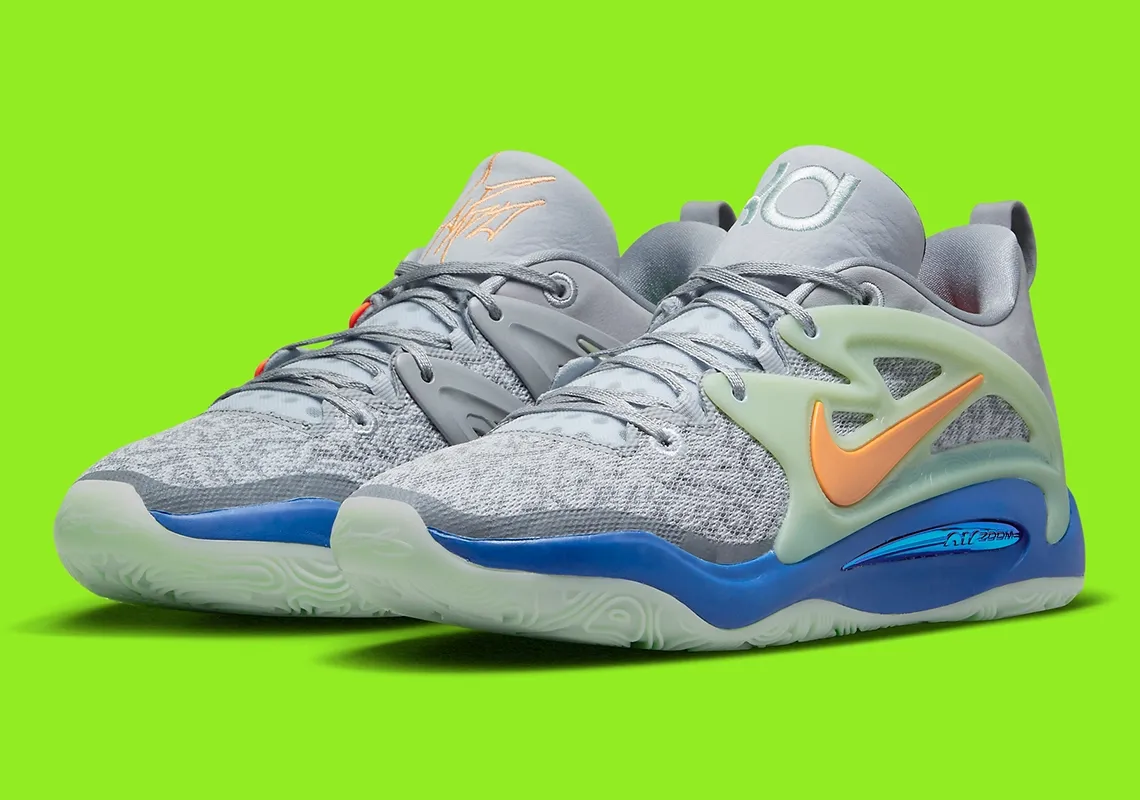 Autre belle récompense à venir, le producteur va bénéficier d’une KD 15 à son nom ! Avec une base en mesh et en daim gris clair accompagnée de notes de vert pâle et d’orange pour faire ressortir les superpositions, les virgules et les logos présents sur la languette. La semelle ressort en vert pâle et bleu.