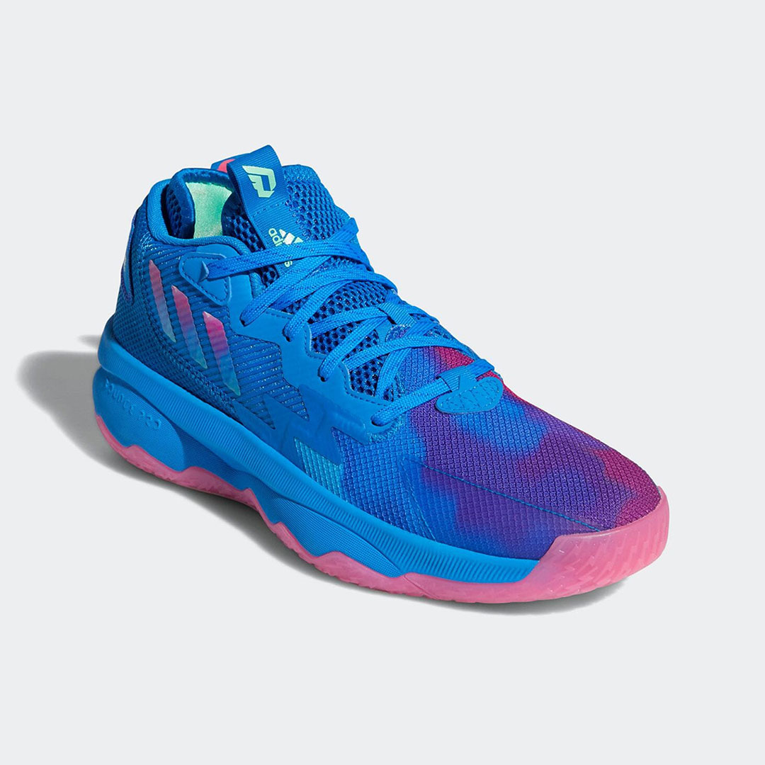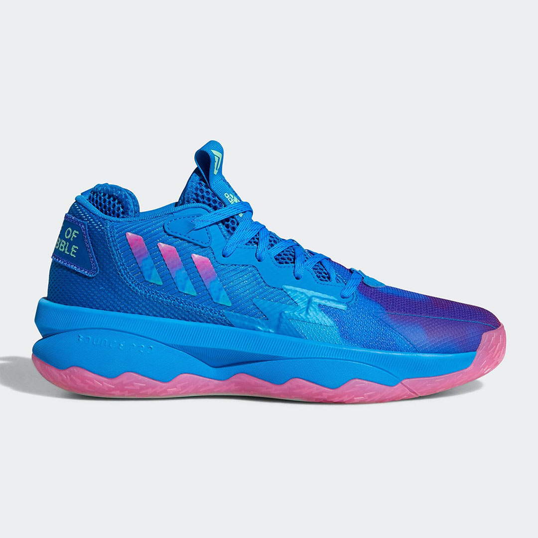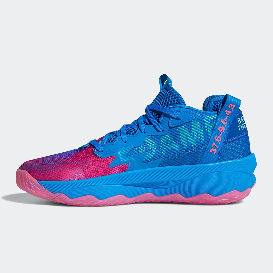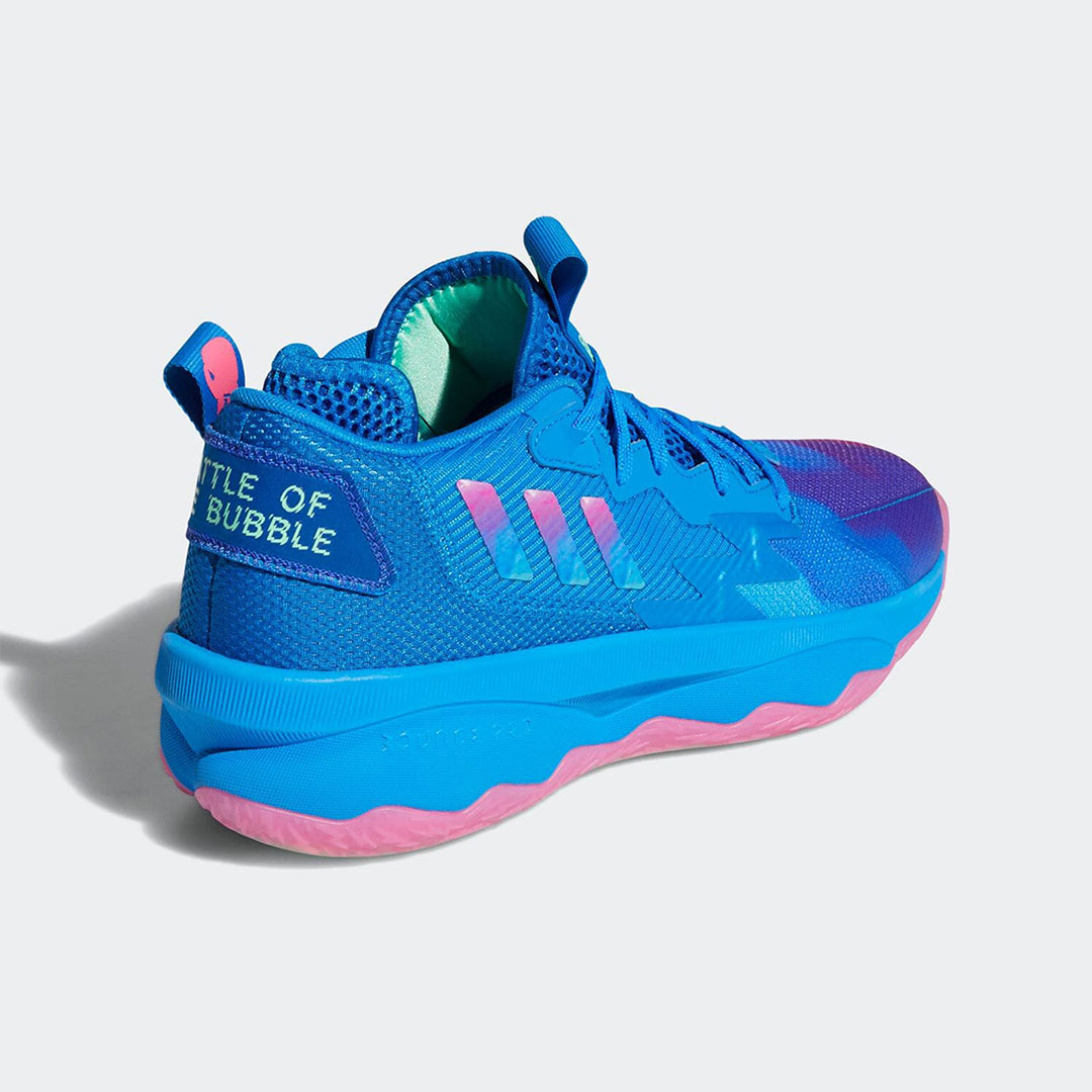 Adidas a décidé d’honorer ce coup de chaud à travers cette Dame 8 « Battle of the Bubble ». Le modèle est mis en valeur avec ce coloris bleu et rose, sur la tige et la semelle, allant jusqu’à des touches de bordeaux et de violet à l’avant. L’inscription « Dame » sur l’empeigne et « Battle of the Bubble » sur le talon ressortent en bleu clair.