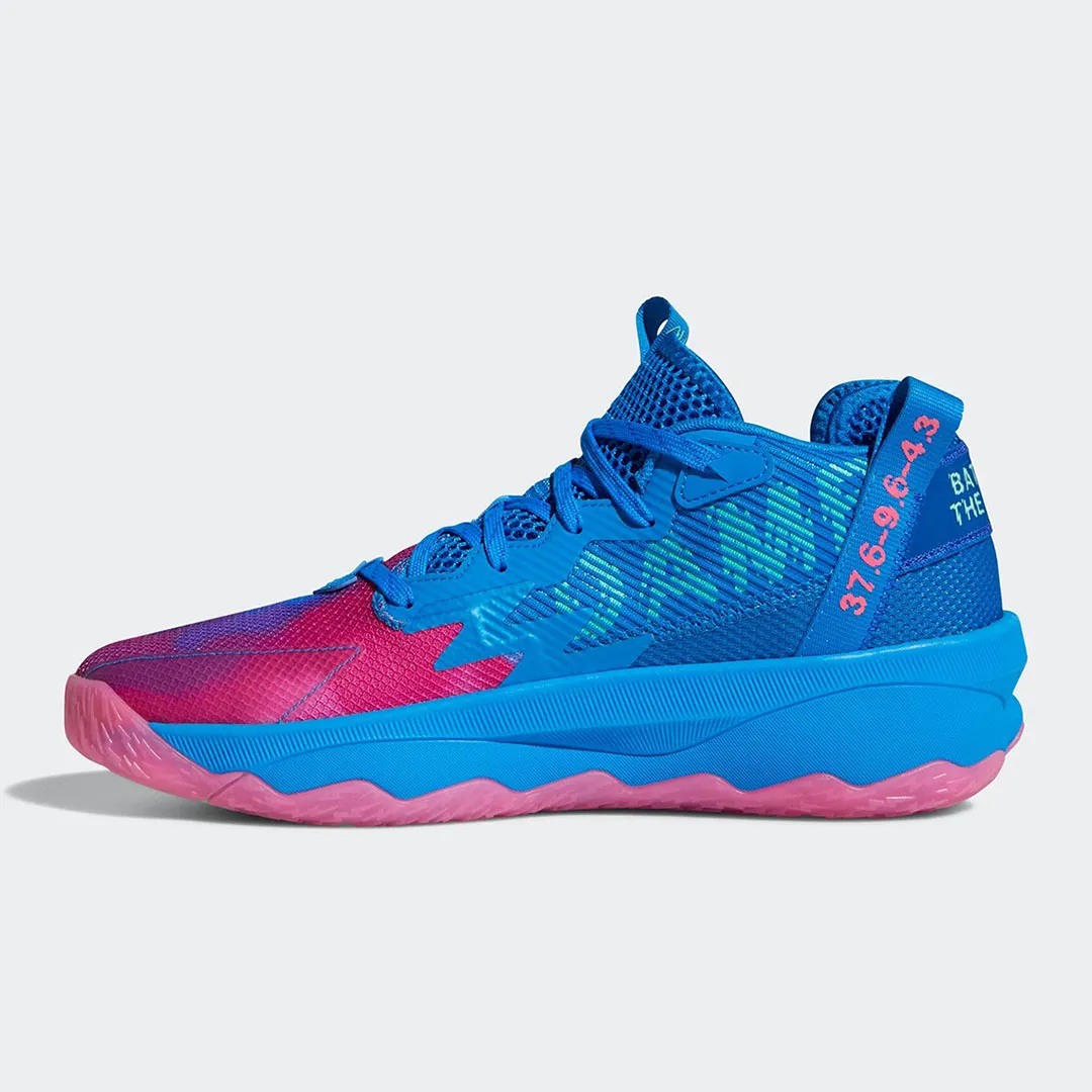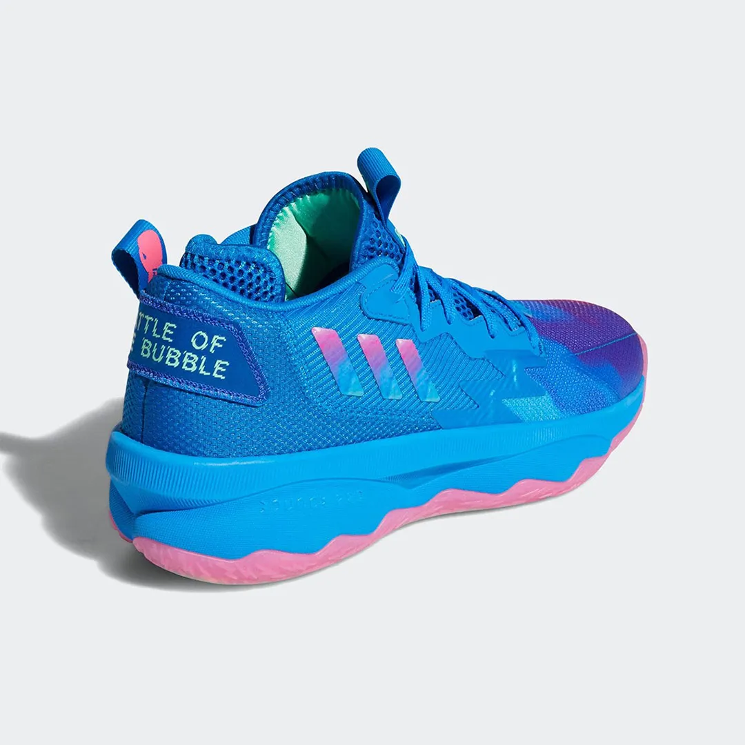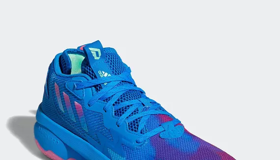 Adidas a décidé d'honorer ce coup de chaud à travers cette Dame 8 « Battle of the Bubble ». Le modèle est mis en valeur avec ce coloris bleu et rose, sur la tige et la semelle, allant jusqu’à des touches de bordeaux et de violet à l’avant. L’inscription « Dame » sur l’empeigne et « Battle of the Bubble » sur le talon ressortent en bleu clair.