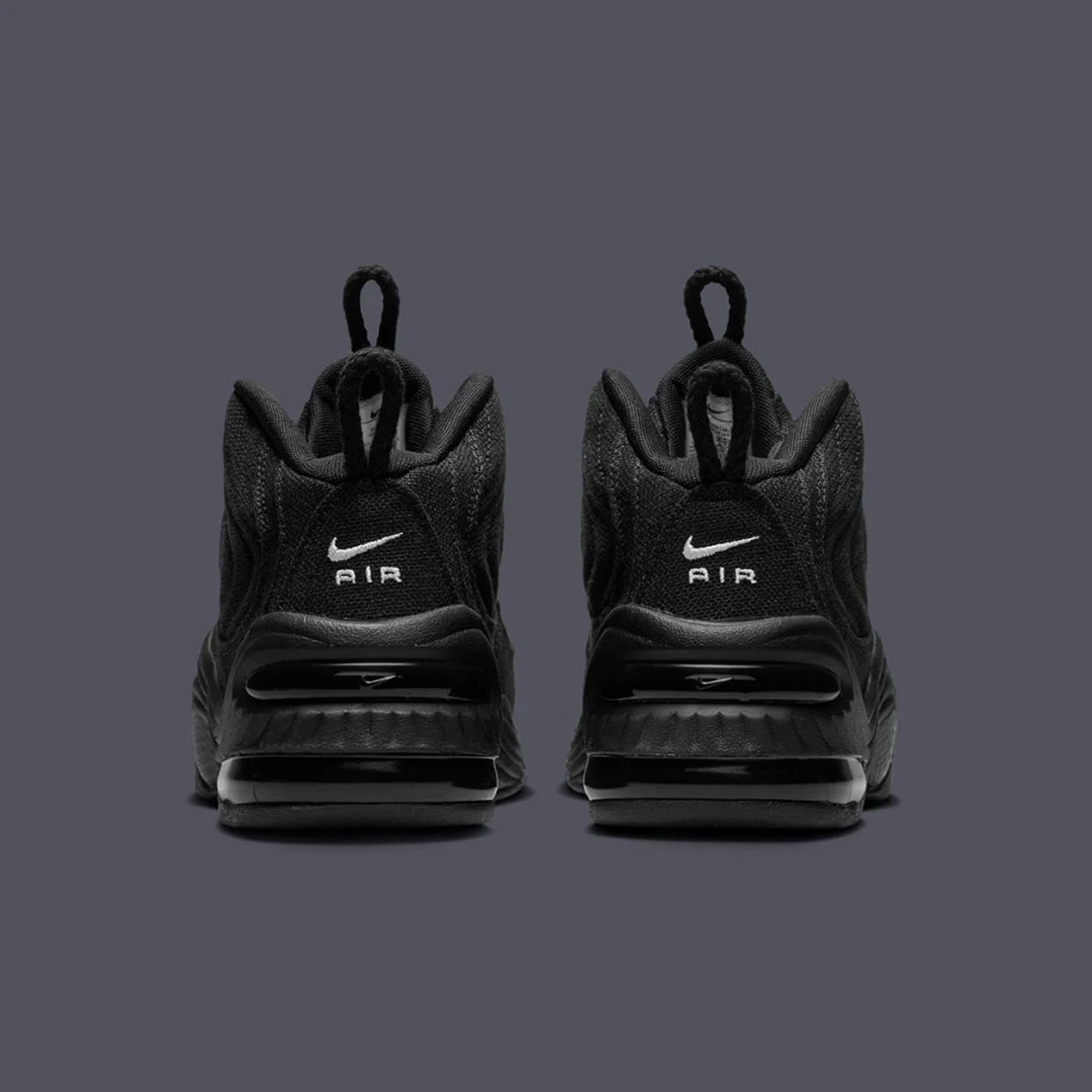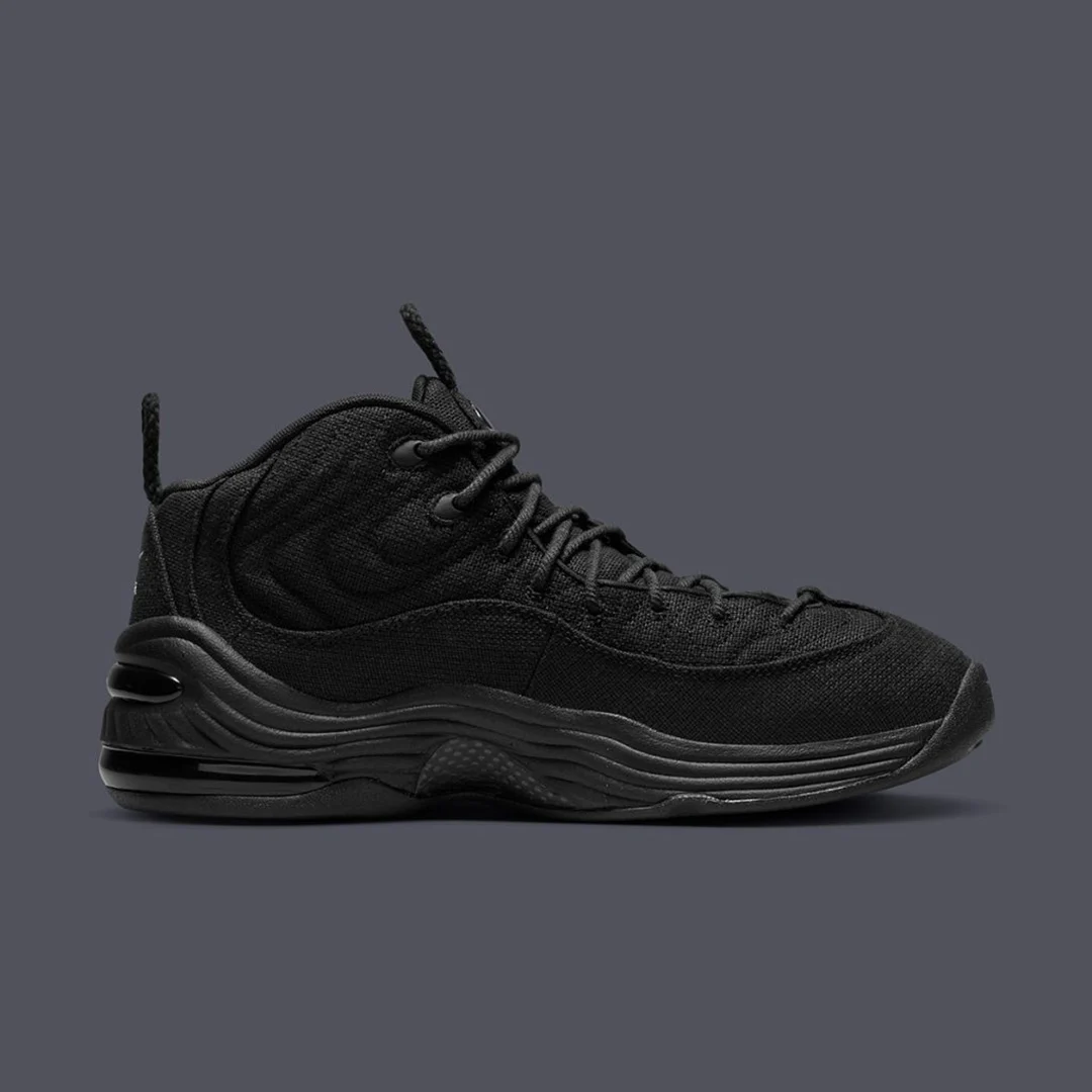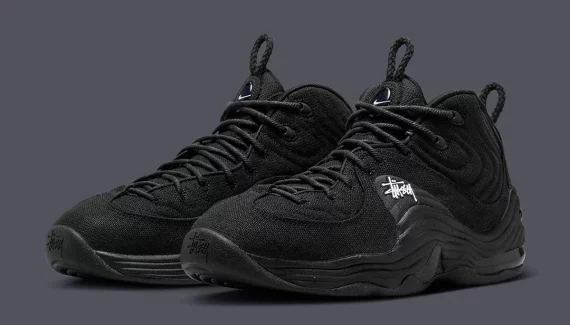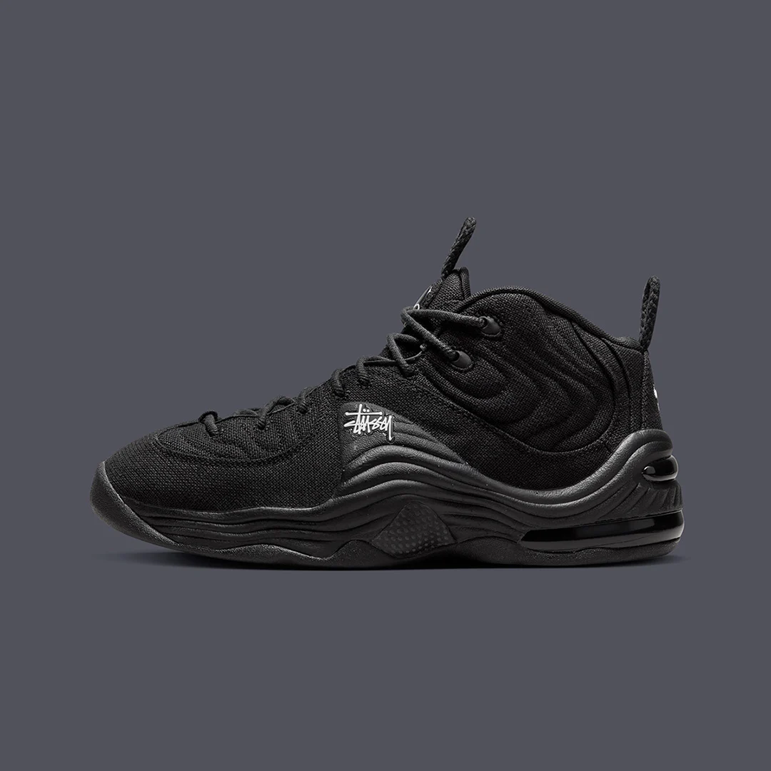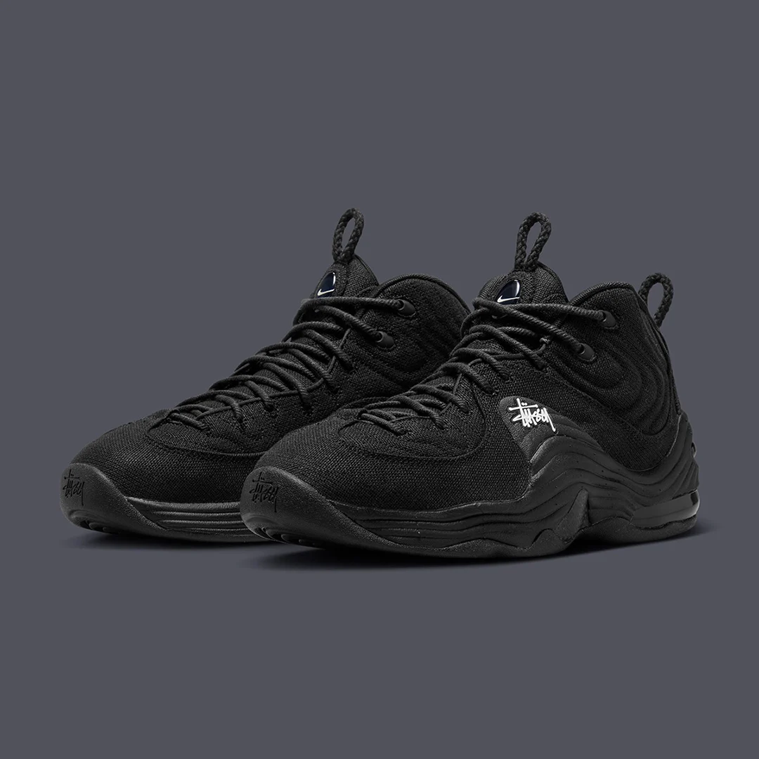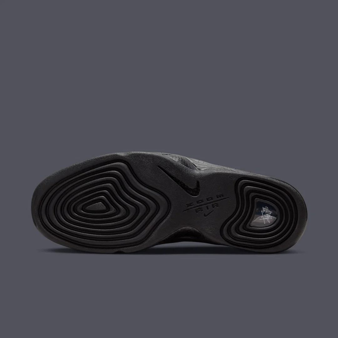 Le coloris présenté est entièrement noir, avec seuls les logos Nike et Stussy en blanc. Le logo « Penny » a par exemple disparu. On note aussi la présence d’une unité Zoom à l’avant du pied et d’une unité Air Max au niveau du talon, l’ensemble reposant sur une semelle extérieure… noire.