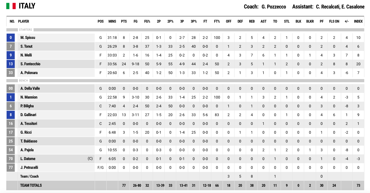 À l’issue d’une prestation poussive, les Bleus de Rudy Gobert (15 points, 7 rebonds), Vincent Poirier (14 points, 13 rebonds), Elie Okobo (11 points) et Guerschon Yabusele (11 points) s’imposent ainsi à l’arrachée contre les Italiens. Des Italiens guidés par Simone Fontecchio (24 points) et Danilo Gallinari (13 points), mais trop indisciplinés pour espérer l’emporter, alors qu’ils en avaient la place.