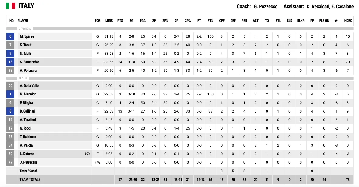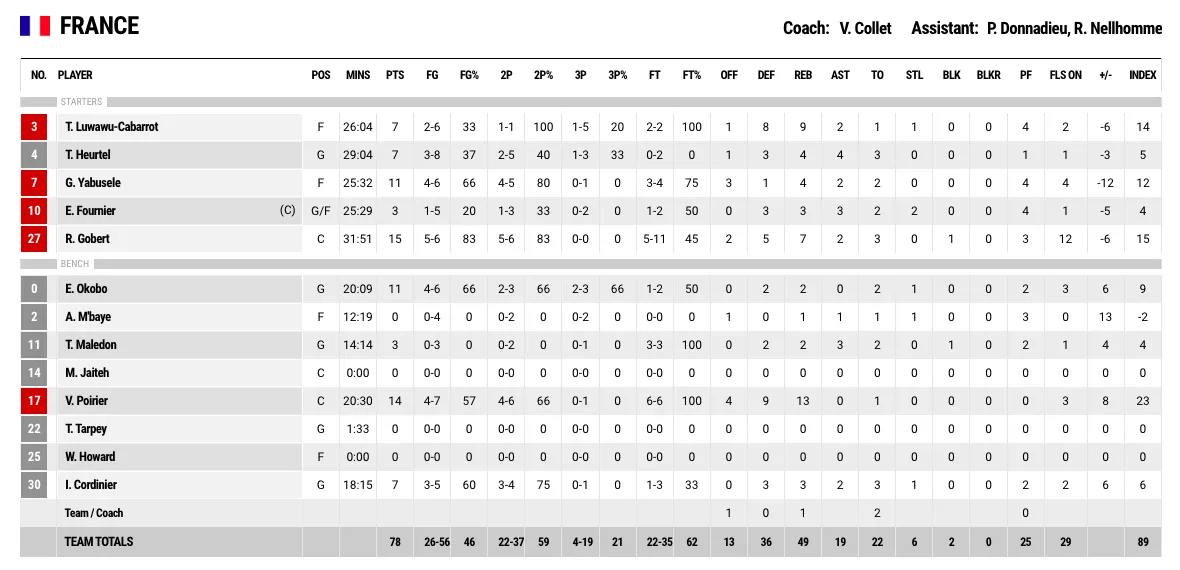 À l'issue d'une prestation poussive, les Bleus de Rudy Gobert (15 points, 7 rebonds), Vincent Poirier (14 points, 13 rebonds), Elie Okobo (11 points) et Guerschon Yabusele (11 points) s'imposent ainsi à l'arrachée contre les Italiens. Des Italiens guidés par Simone Fontecchio (24 points) et Danilo Gallinari (13 points), mais trop indisciplinés pour espérer l'emporter, alors qu'ils en avaient la place.