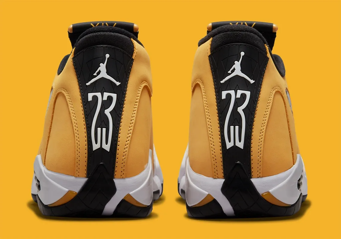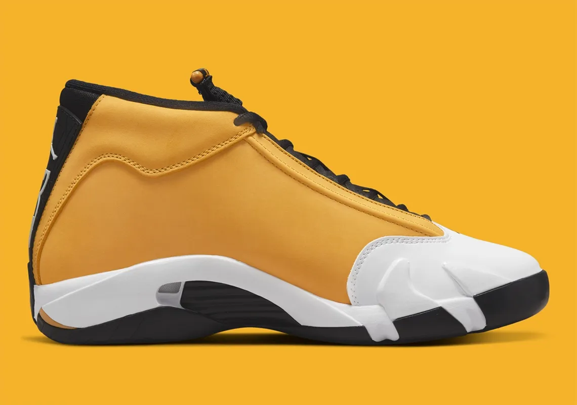 Prévue pour cette semaine, la Air Jordan 14 « Ginger » est de retour. Elle présente un coloris jaune pêche sur la tige en daim (aux poils courts), assortie d’une partie blanche à l’avant. La languette, le talon sur lequel apparaissent le « Jumpman » et le numéro 23 en blanc, et la semelle extérieure ressortent en noir.