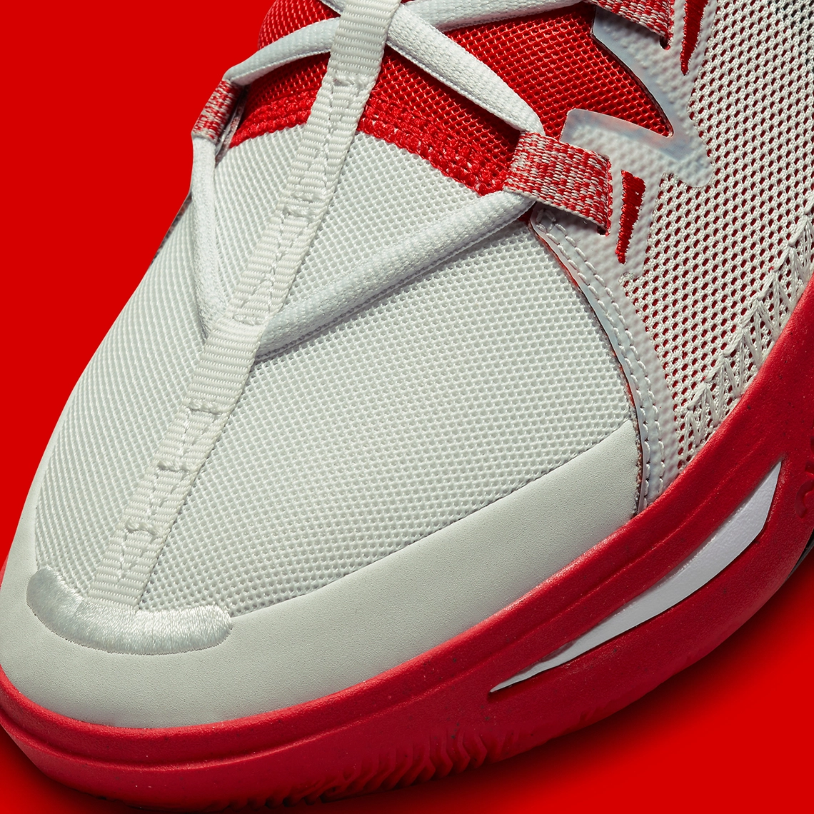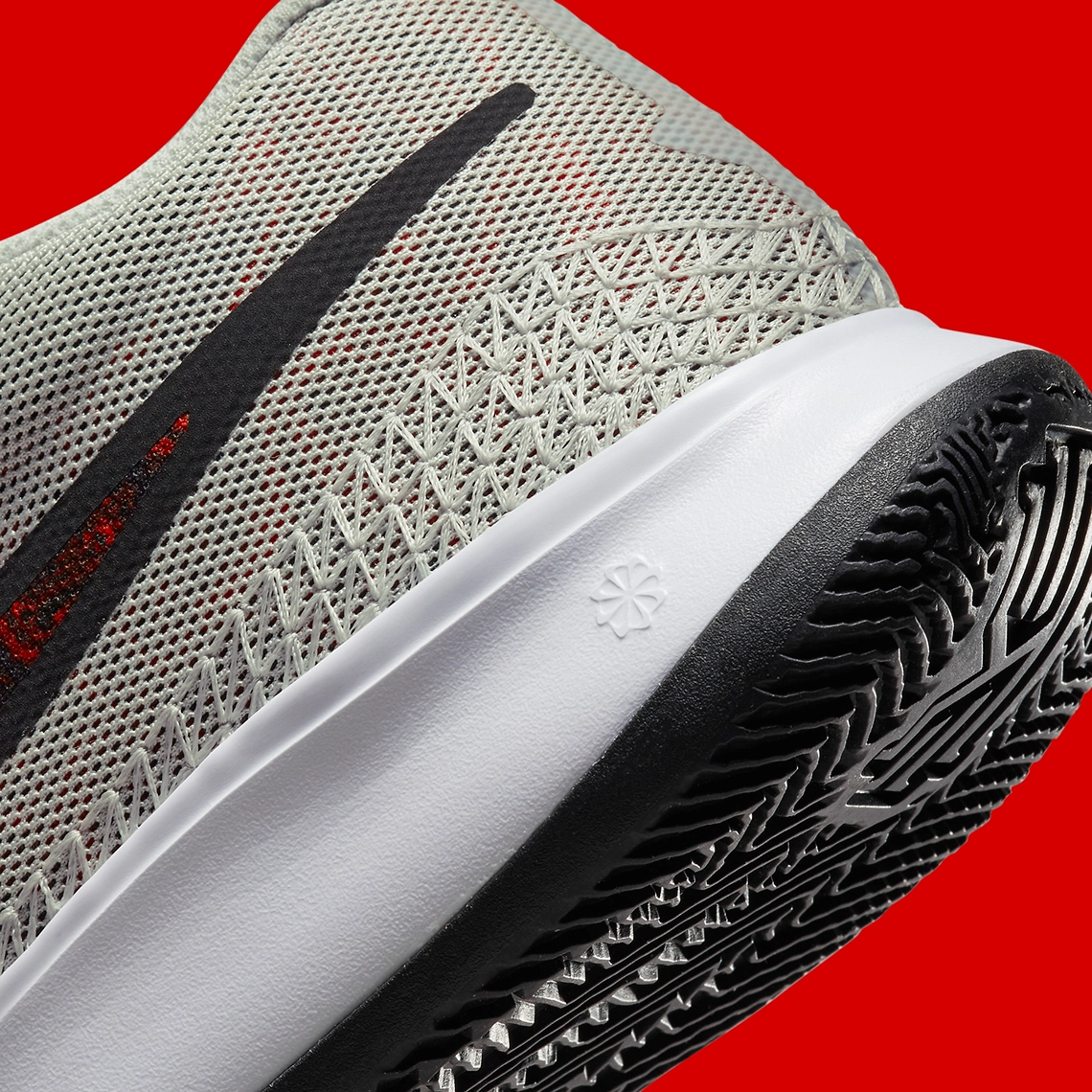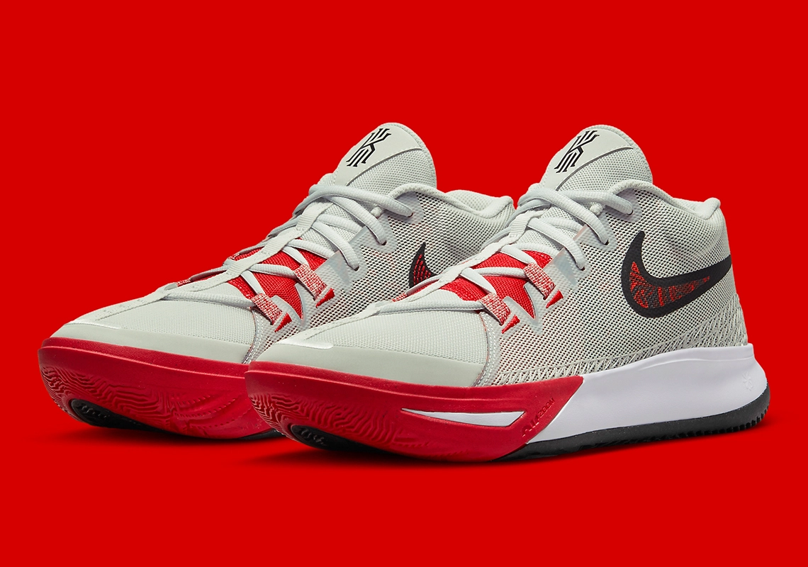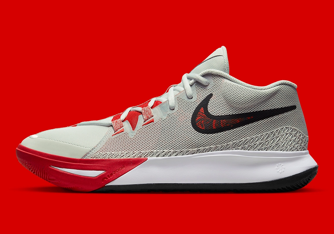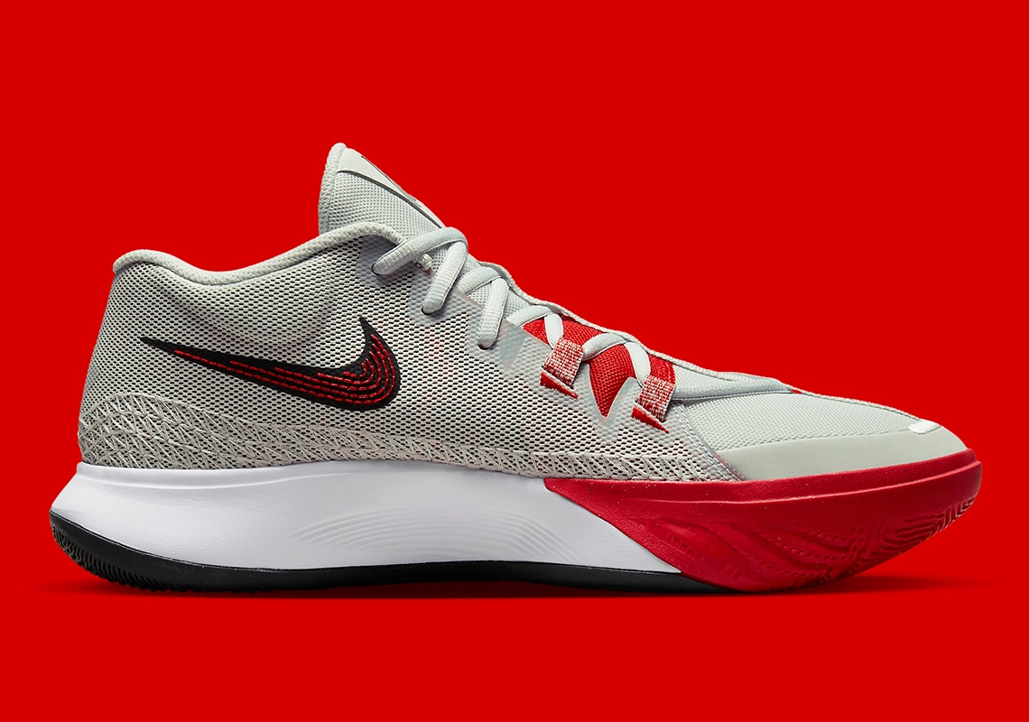 Après un premier coloris « Nets » en noir et blanc, la Kyrie Flytrap 6 se présente sous un nouveau coloris plus clair. Celui-ci a le mérite d’en dévoiler un peu plus sur la composition de la paire, avec une tige dotée de mesh multicouches, en gris en l’occurrence, et une base renforcée, notamment à l’arrière par un motif « cousu », remontant presque au niveau du « Swoosh » en rouge et noir.