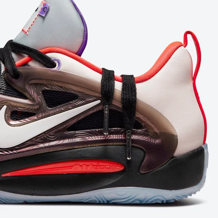 La tige en mesh noir et superposée de touches en violet, orange et blanc cassé. Les parties latérales en TPU ressortent dans un noir transparent, avec un « Swoosh » blanc. Comme sur chaque modèle, l’intérieur de la languette contient un message propre à la paire « Charles Douthit » en l’occurrence. La semelle intermédiaire noire et la semelle extérieure en bleu glacé complètent l’ensemble.