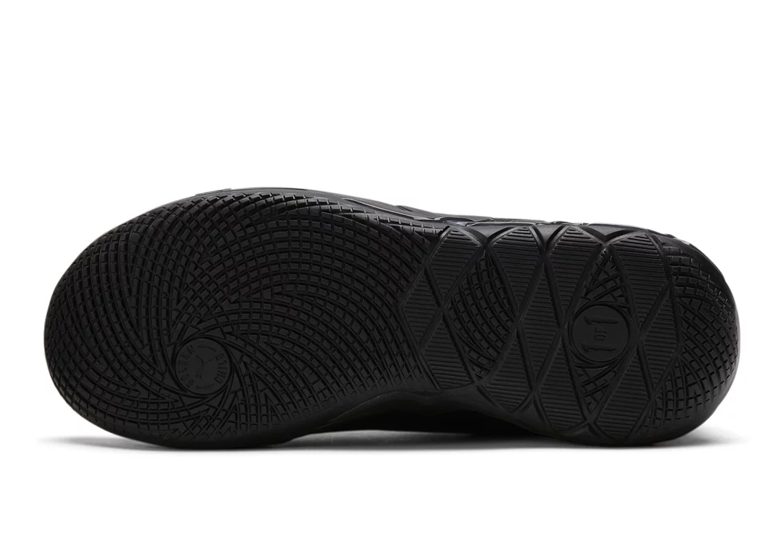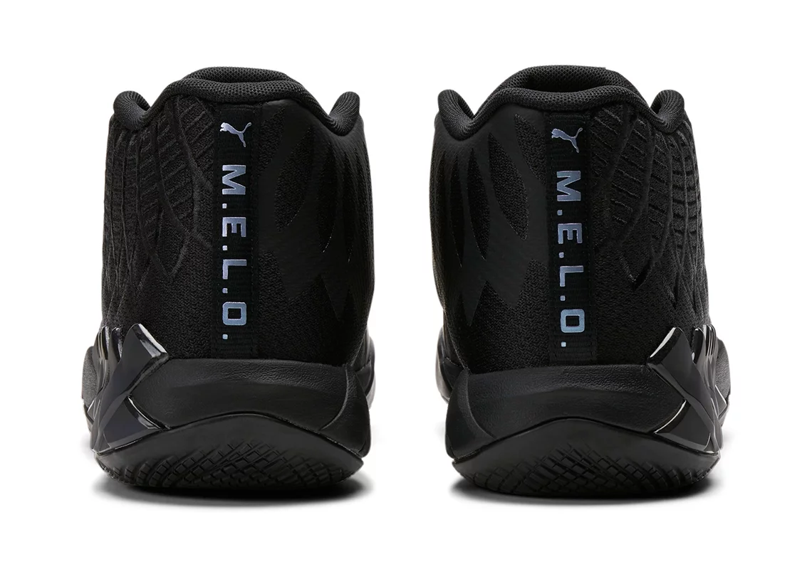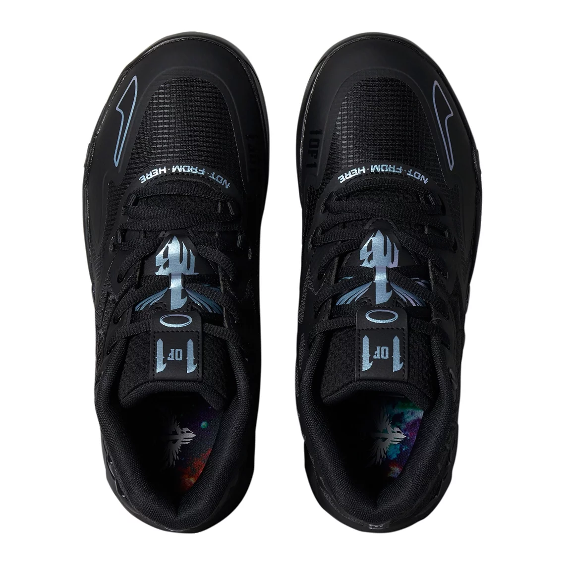La tige entièrement noire, tout comme la semelle, est contrastée par touches iridescentes lumineuses sur les finitions, comme le logo « 1-of-1 » de la languette, le « M.E.L.O » au niveau du talon, ou l’inscription « Not from here » à la base des lacets.