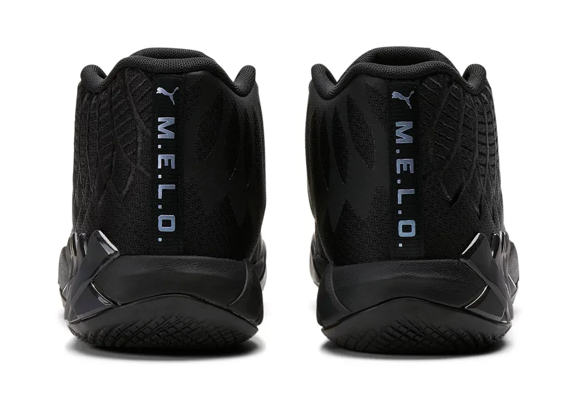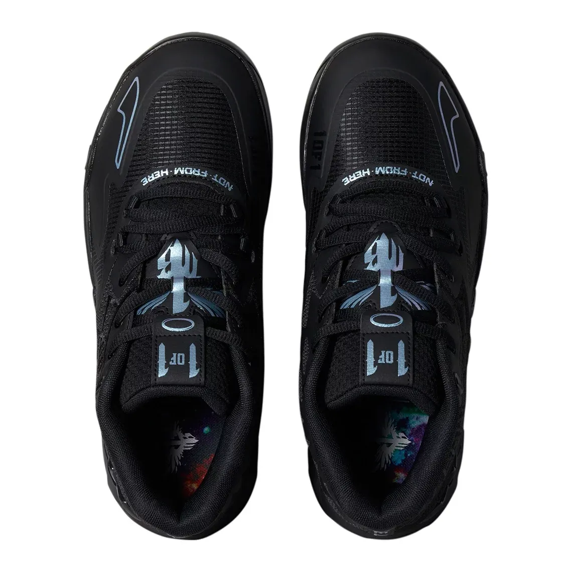 La tige entièrement noire, tout comme la semelle, est contrastée par touches iridescentes lumineuses sur les finitions, comme le logo « 1-of-1 » de la languette, le « M.E.L.O » au niveau du talon, ou l'inscription « Not from here » à la base des lacets.