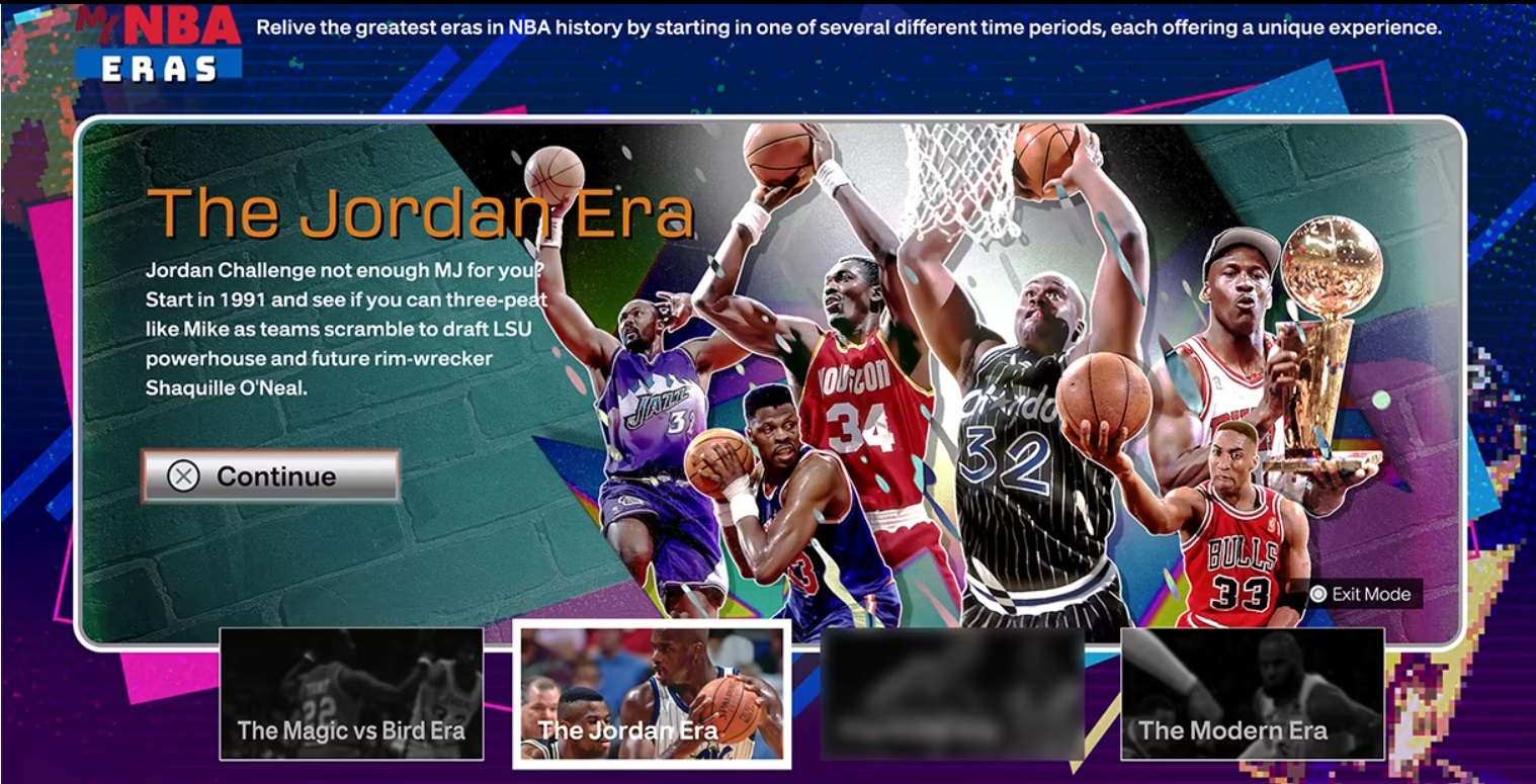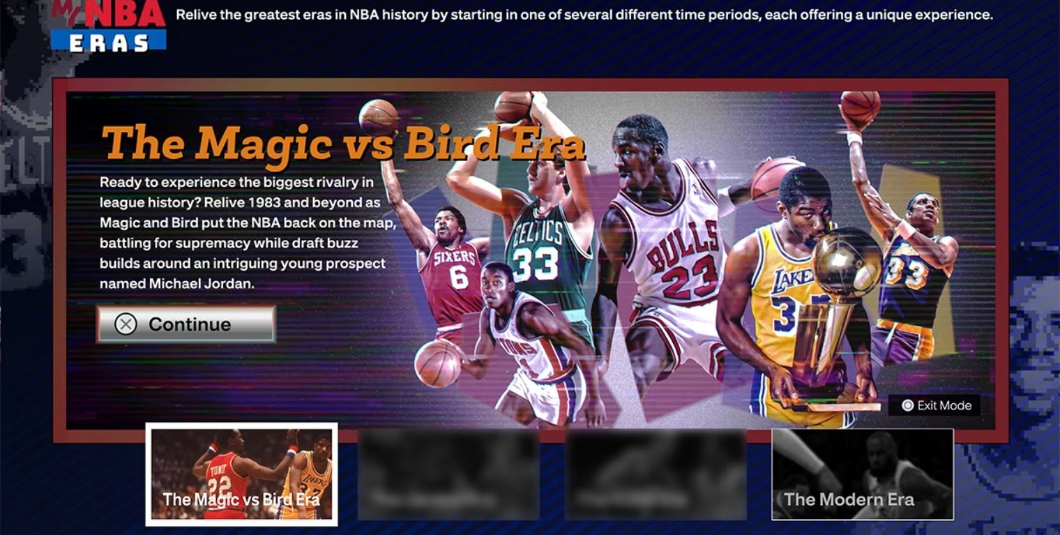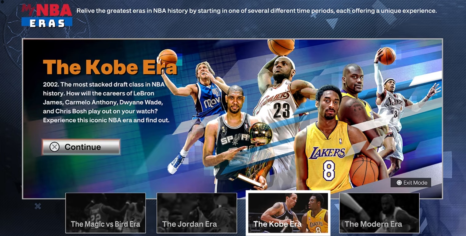 Il permet de remonter le temps et d’attaquer une saison à partir de trois dates charnières : 1983, baptisée la « Magic vs Bird Era », 1991 pour la « Michael Jordan Era » et 2002 pour la « Kobe Era ».