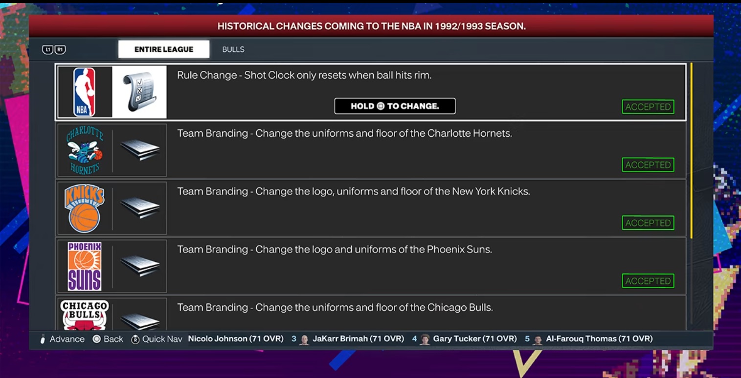 « Le mode donnera aux joueurs un résumé de fin d’année leur indiquant ce qui va se passer dans la prochaine saison, comme des changements de règles ou des déménagements de franchises. Vous pouvez dire : ‘Non, non, non, je ne veux pas que les Hornets se déplacent entre les huit villes où ils ont joué pendant cinq ans’. Vous pouvez refuser la relocalisation des SuperSonics de Seattle », a souligné Mike Boenisch, producteur exécutif emblématique du jeu.