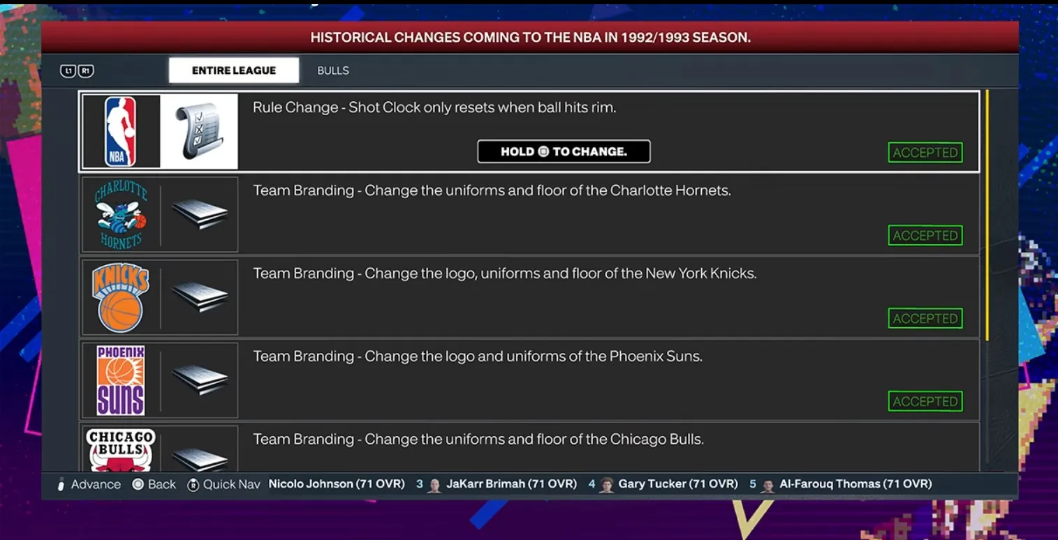 « Le mode donnera aux joueurs un résumé de fin d'année leur indiquant ce qui va se passer dans la prochaine saison, comme des changements de règles ou des déménagements de franchises. Vous pouvez dire : ‘Non, non, non, je ne veux pas que les Hornets se déplacent entre les huit villes où ils ont joué pendant cinq ans'. Vous pouvez refuser la relocalisation des SuperSonics de Seattle », a souligné Mike Boenisch, producteur exécutif emblématique du jeu.