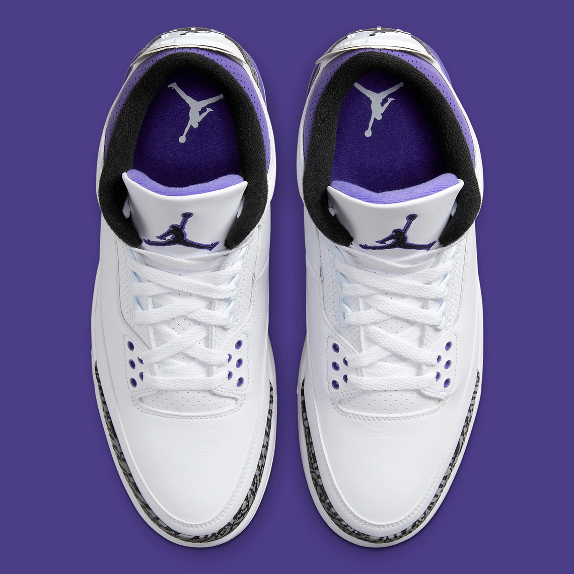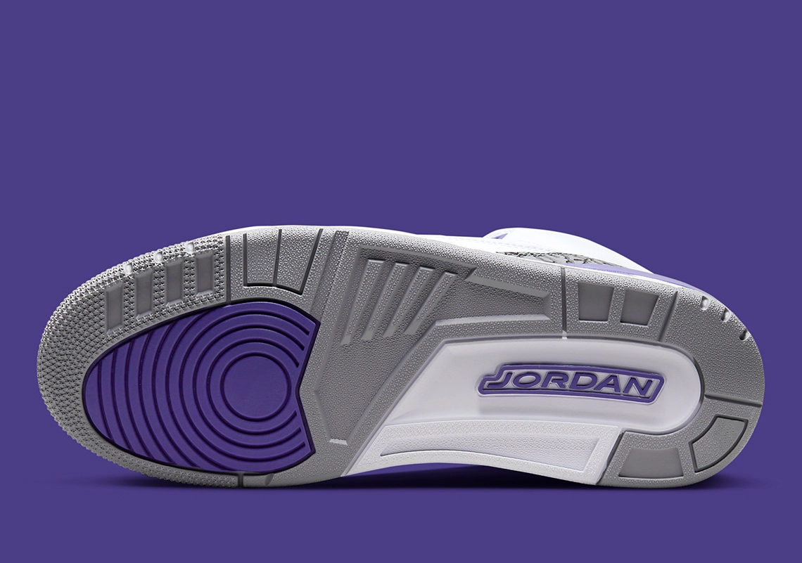Des touches de violet viennent compléter l’ensemble, à l’arrière de la semelle intermédiaire, sur le col et les contours du « Jumpman » noir présent sur la languette.