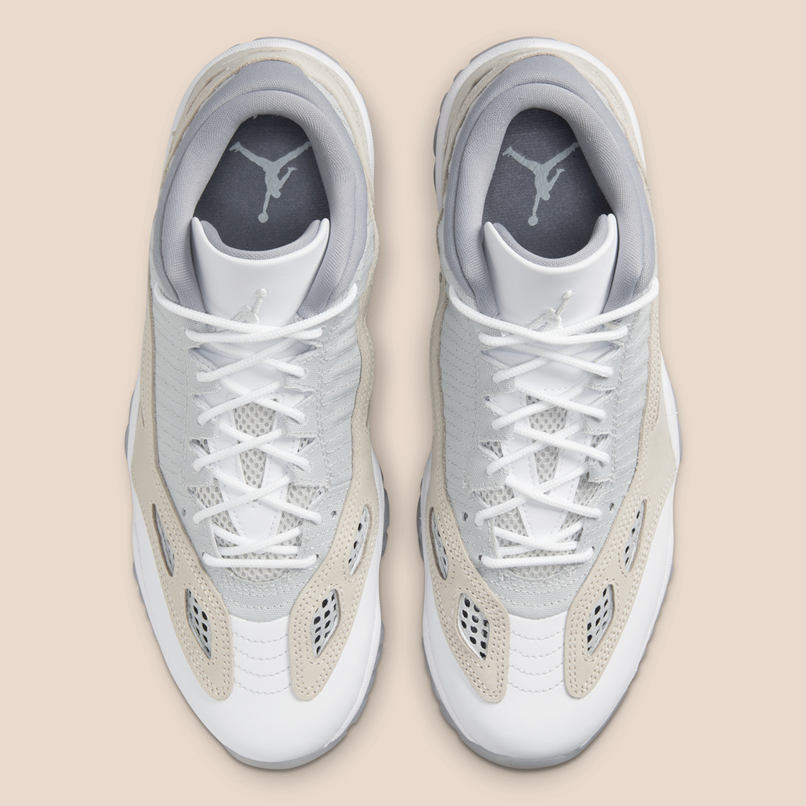 On retrouve une tige composée de plusieurs teintes « crème », agrémentée de bandes en beige contenant des aérations en gris. La semelle alterne également entre le blanc nacré et le gris.