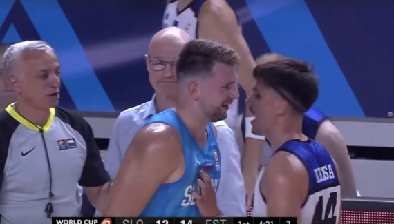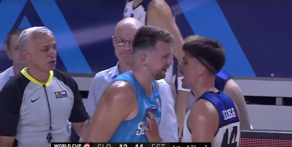 Alors que le meneur slovène commet une faute sur un tir extérieur d’un joueur estonien, il s’en va de ce pas plaider sa cause auprès de l’arbitre qui vient de siffler, comme il en a souvent l’habitude. Une attitude qui agace Kerr Kriisa, qui fait signe à Luka Doncic, avec son index, de ne pas nier sa faute. S’en suit un bref échange, probablement pas particulièrement amical, puis une double faute technique pour les deux meneurs.