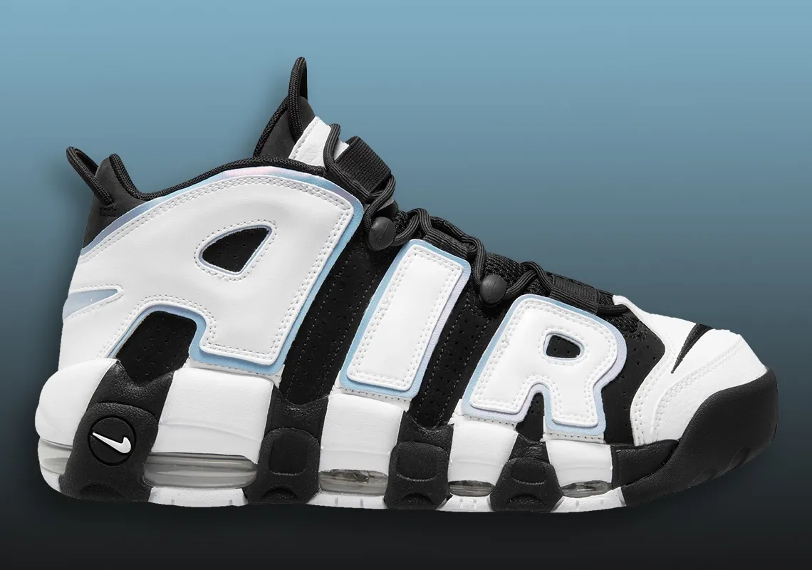 La tige en daim noir sur les parties latérales est recouverte du fameux lettrage « AIR » sur une superposition de bleu clair et de blanc. L'avant de la paire est également blanc, agrémenté d'un « Swoosh » noir. La semelle est également noire et blanche, en mode zébré !