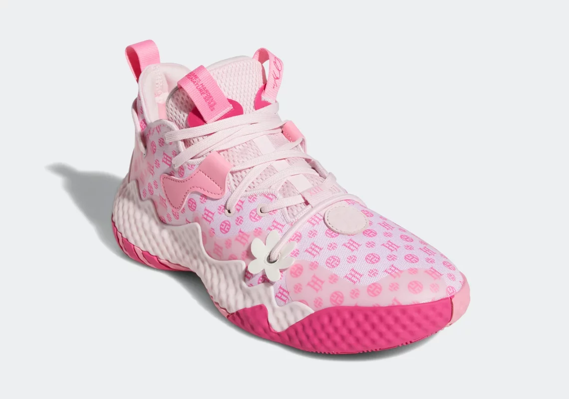 Sur la Harden Vol. 6, la tige est recouverte de motifs faisant ressortir le logo « JH » du joueur. On note aussi l’aspect d’une fleur blanche au niveau des œillets. Comme sur la languette, la semelle est recouverte de deux notes de rose, le plus foncé faisant notamment ressortir les trois bandes de la marque adidas au niveau du talon.