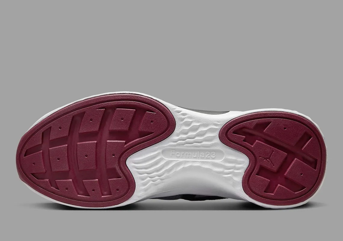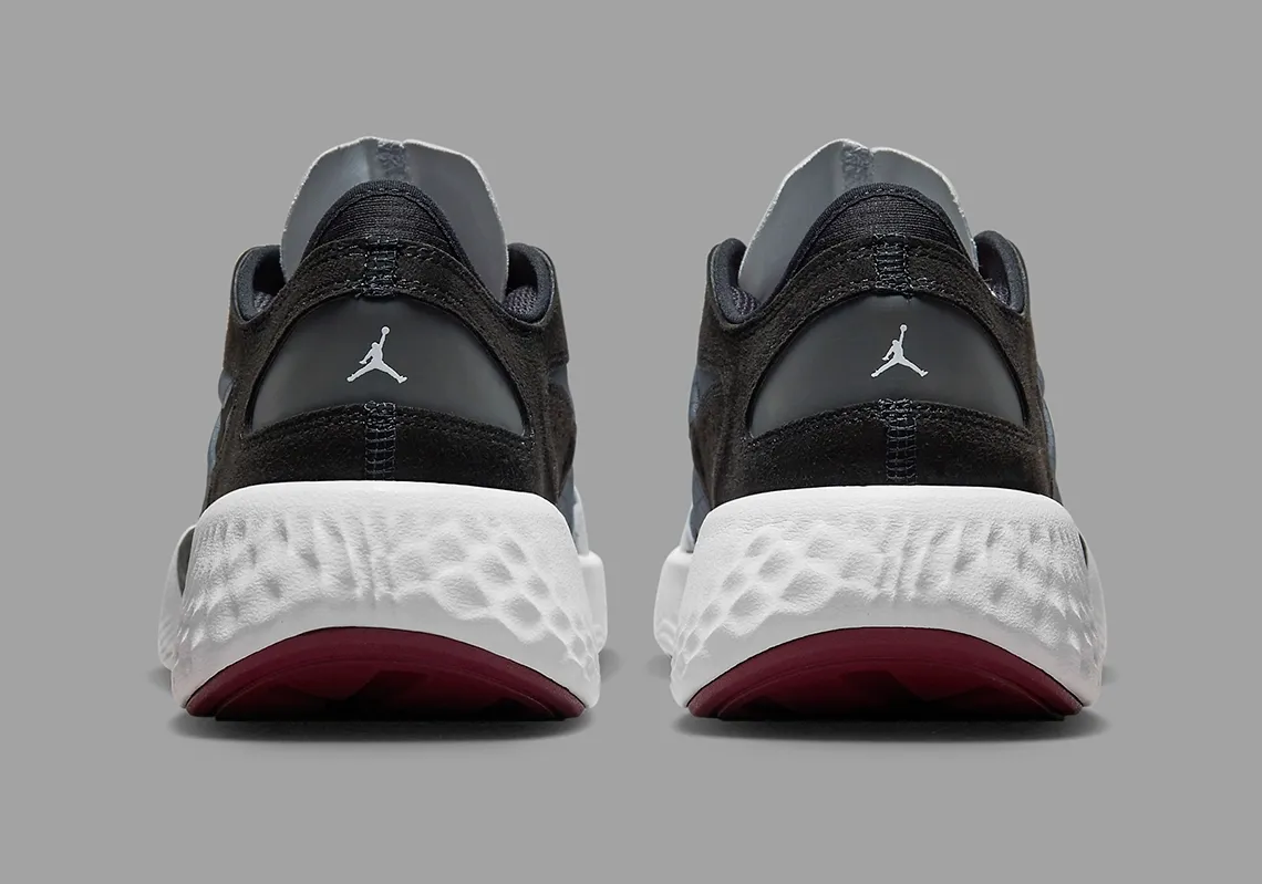 Une bande raccorde l’avant de la chaussure en daim gris avec le reste de la tige. Une autre touche de bordeaux apparait sur la languette, tandis que l’arrière de la chaussure apparaît en noir avec du daim également. La semelle ressort pour sa part en bordeaux et blanc.