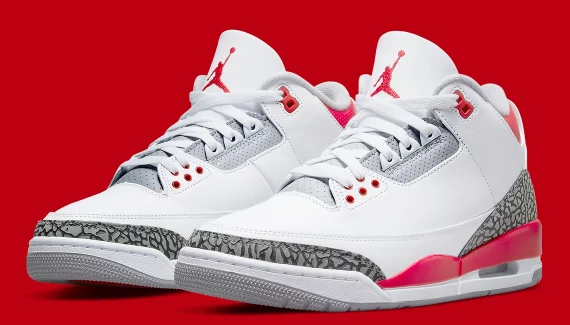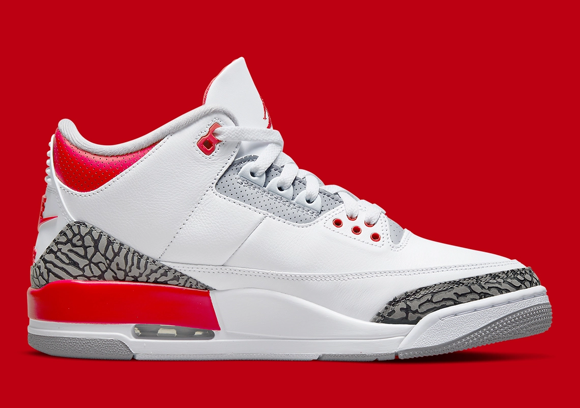La Air Jordan 3 « Fire Red » qui sortira ce samedi sur le sol nord-américain dispose en effet d’une tige blanche agrémentée de finitions en rouge, sur la semelle intermédiaire, le col ou les logos « Nike Air » présent sur le talon ainsi que le Jumpman sur la languette. La base de la tige est en imprimé « éléphant » noir et gris.