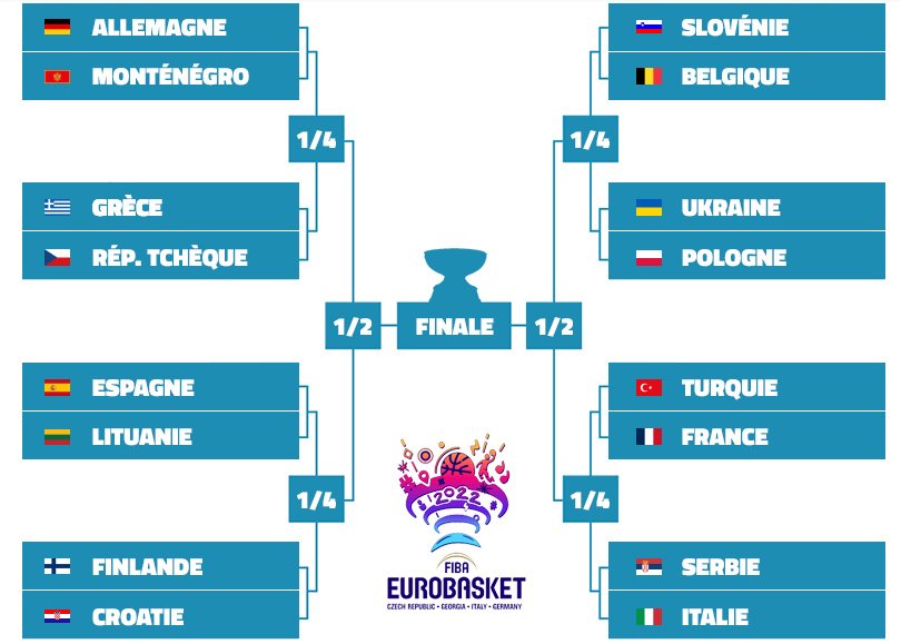 Pour rappel, il y aura quatre matchs samedi : Turquie – France à 12h00, Slovénie – Belgique à 14h45, Allemagne – Monténégro à 18h00 et Espagne – Lituanie à 20h45. Il y aura également quatre matchs dimanche : Ukraine – Pologne à 12h00, Finlande – Croatie à 14h45, Serbie – Italie à 18h00 et Grèce – République tchèque à 20h45.