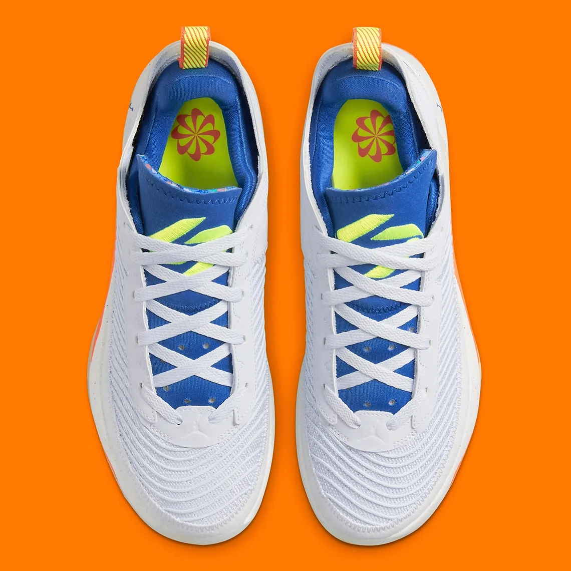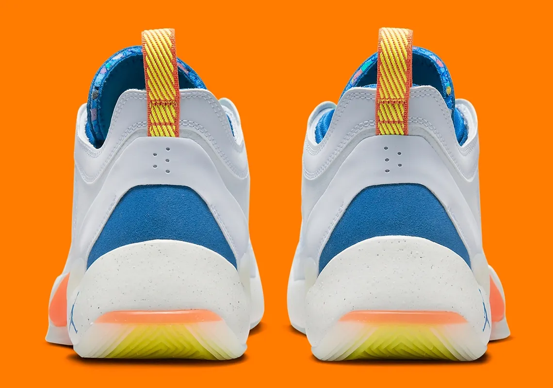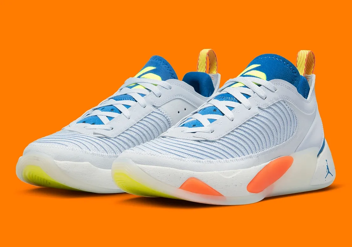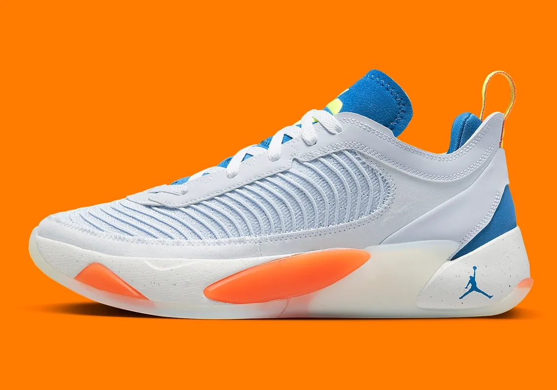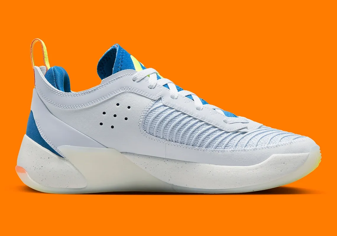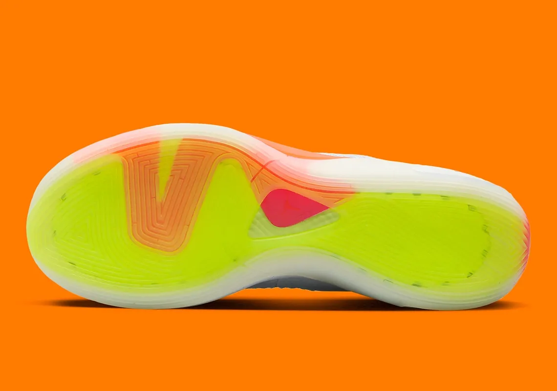 Voici en tout cas les photos de cette nouvelle version, avec cette tige en blanc-bleu clair qui se distingue par ses câbles FlyWire. La languette, sur laquelle le logo du joueur apparaît en jaune, le talon et le col, ressortent en bleu foncé, tandis que des touches de jaune et d'orange complètent la semelle blanche.