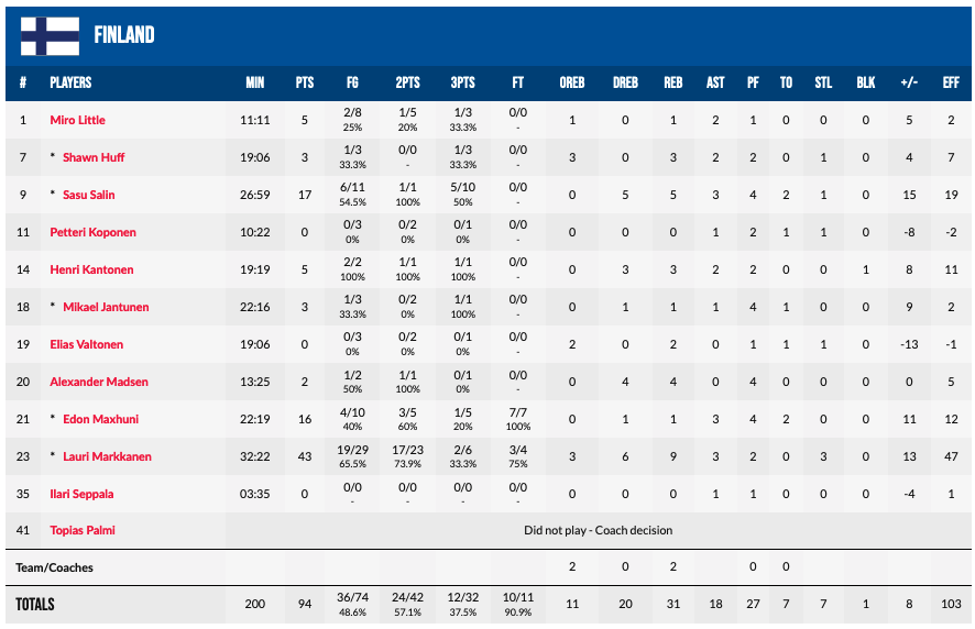 Pour Lauri Markkanen, ce match à 43 points représente la 8e meilleure performance au scoring de l’histoire de l’EuroBasket, à égalité avec Giorgos Kolokithas (1967) et Dirk Nowitzki (2001). C’est déjà le troisième match à plus de 40 points de cet Euro, après les 47 points de Luka Doncic et les 41 points de Giannis Antetokounmpo.