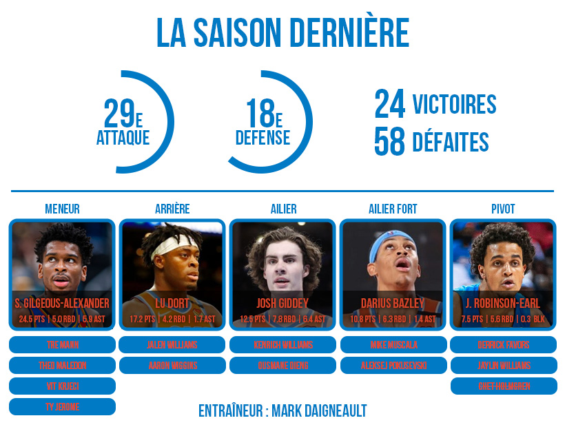 Il ne lui reste donc plus qu’à briller collectivement, ou du moins faire mieux que sur les deux dernières campagnes (31% puis 29% de victoires, en 2020/21 puis 2021/22). Le problème, c’est que le supporting cast du talentueux Canadien n’est —encore une fois— pas le plus qualitatif qui soit. Dans ces conditions, « SGA » n’aura pas d’autre choix que d’assumer son statut de star en devenir, afin de tirer tout son groupe vers le haut, sans pour autant perturber le développement de Josh Giddey.