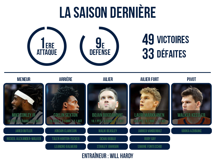 Les vétérans parviennent aussi à tirer leur épingle du jeu, sans empiéter sur le développement de leurs jeunes coéquipiers : Mike Conley continue d’apporter une présence stabilisatrice en attaque, notamment sur “pick-and-roll” pour les jeunes pivots Walker Kessler et Udoka Azubuike, quand Bojan Bogdanovic et Jordan Clarkson apportent comme toujours du tir extérieur et des points. À l’approche de la “trade deadline”, ils sont même récompensés pour leur patience et leur professionnalisme, et sont transférés vers des équipes du haut de tableau en échange de plusieurs futurs choix de Draft.