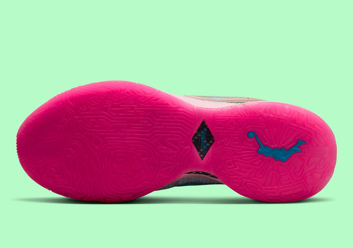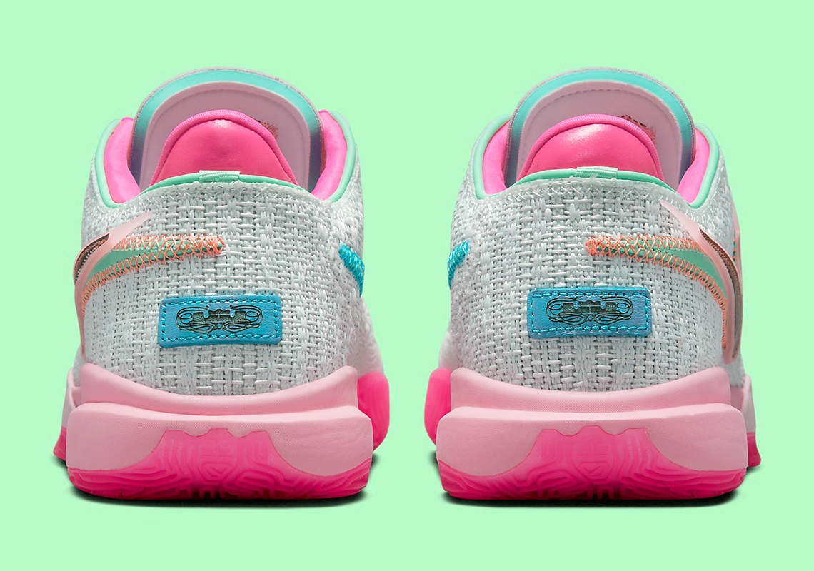 Baptisé « Barely Green », le coloris a été dévoilé officiellement, l’occasion d’y jeter à nouveau un coup d’œil un peu plus appuyé. On retrouve un thème assez similaire à la dernière version « Violet Frost », sauf que la tige est en vert cette fois, et que les deux logos « Swoosh » superposés apparaissent en vert-bleu turquoise. La semelle et l’intérieur du col ressortent en rose.