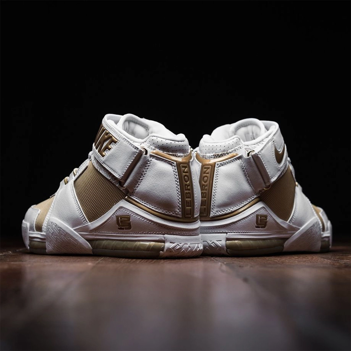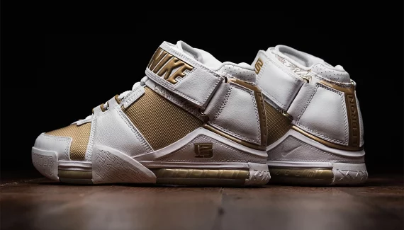 A cette époque, LeBron James avait donc porté ce coloris marqué par du cuir blanc assorti par des touches dorées sur la tige. Les finitions comme le gros « Nike » sur le strap supérieur complètent l’ensemble.