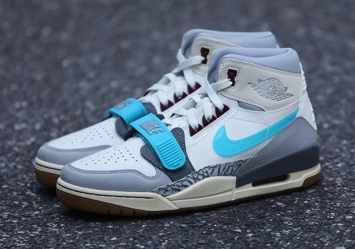 Au niveau couleurs, on retrouve deux teintes de gris et de blanc pour habiller la tige, cette dernière étant contrastée par le strap et le « Swoosh » qui ressortent en bleu. Les œillets et le logo « Jumpman » présent sur le talon apparaissent en bordeaux, tandis que la semelle offre un mélange de blanc nacré et de marron.