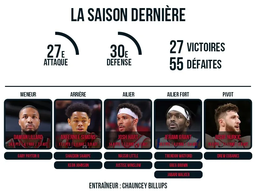 Ayant atteint leur plafond (une finale de conférence en 2019, conclue sur un coup de balai des Warriors) avec sa traction arrière composée de Damian Lillard et CJ McCollum, les Blazers ont décidé de trancher dans le vif et disloquer ce duo qui guidait le destin de l'équipe depuis cinq ou six saisons, avec le transfert de CJ McCollum à La Nouvelle-Orléans en février dernier. Après cette “année sans” conclue dans les tréfonds de la conférence Ouest sur un bilan tristounet de 27 victoires pour 55 défaites, la franchise de l'Oregon veut repartir sur un nouveau projet avec Joe Cronin et Chauncey Billups aux manettes.