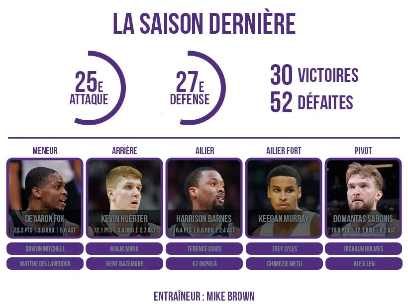 La saison dernière, les Kings ont manqué les playoffs pour la 16e saison consécutive, la plus longue série de l'histoire de la ligue. Le club a débuté l'exercice avec un “roster” différent de celui avec lequel il l'a terminé en avril, puisque l'échange avec les Pacers, centré autour de Domantas Sabonis et Tyrese Haliburton, a secoué les deux effectifs au début du mois de février, à quelques heures de la “trade deadline”.