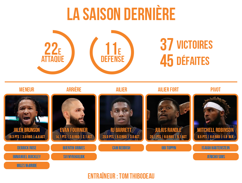 – Arrivées : Jalen Brunson (Mavericks), Isaiah Hartenstein (Clippers), Svi Mykhailiuk (Raptors), Trevor Keels (Draft), DaQuan Jeffries