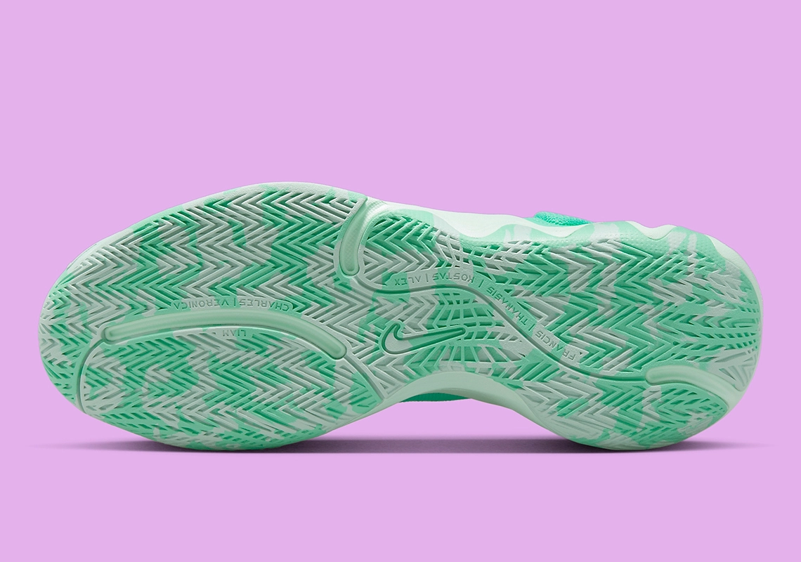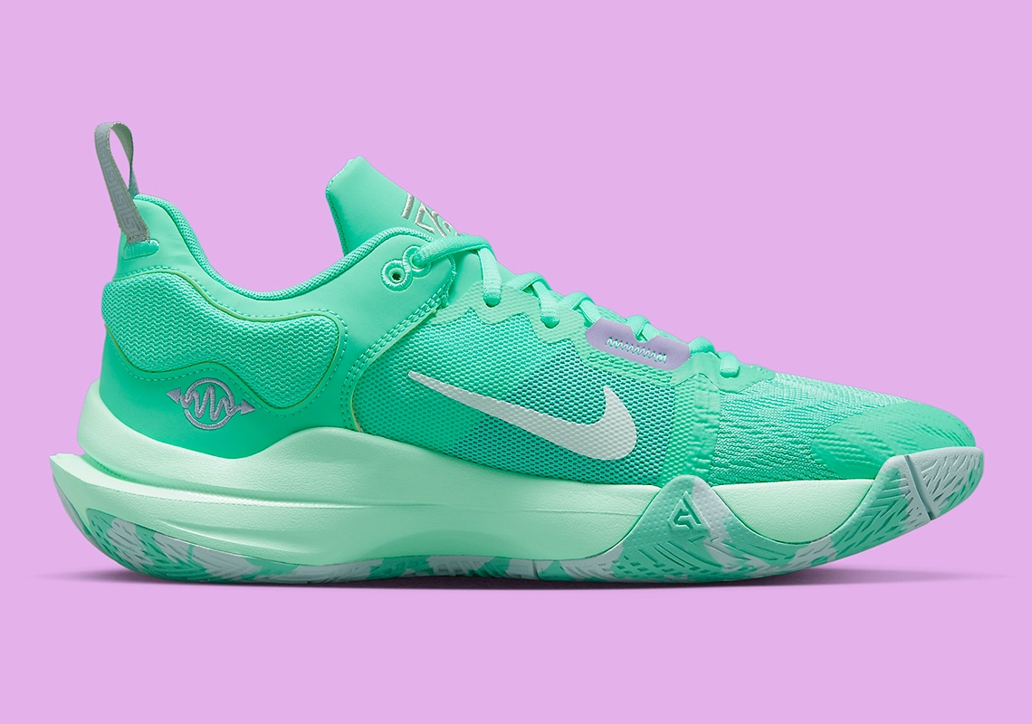 Le précédent coloris dévoilé en juin avait fait la part belle à l’orange. Cette fois, c’est du vert pâle qui vient habiller l’ensemble de la tige et une bonne partie de la semelle. On peut noter quelques finitions en doré, comme les logos sur la languette, un « Swoosh » en blanc nacré, et des oeillets en violet.