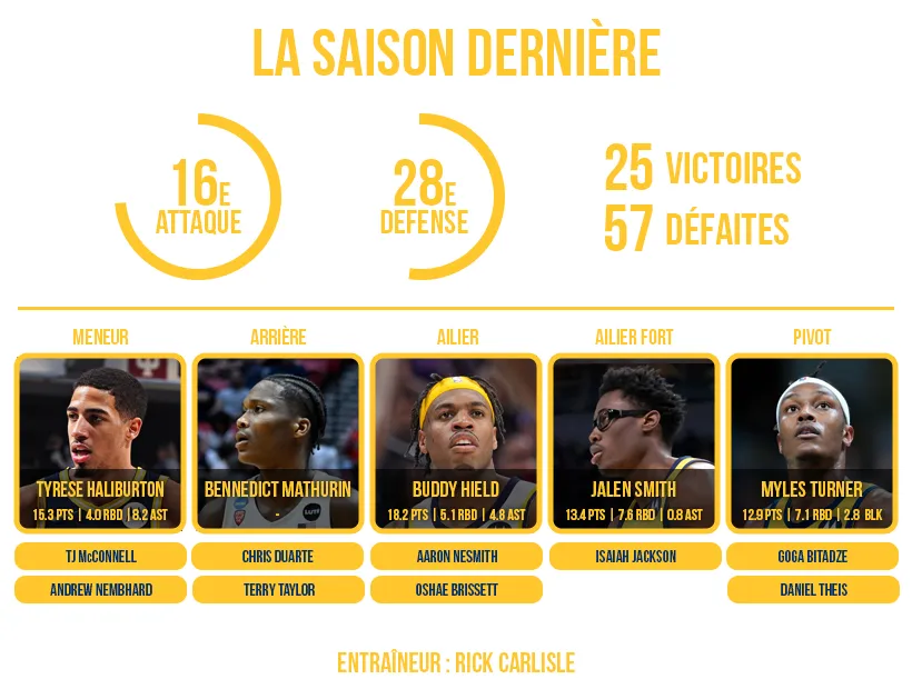 Malgré les insistants bruits de couloir, Myles Turner et Buddy Hield restent dans l'Indiana, ce qui facilite la vie de Rick Carlisle. Tyrese Haliburton prend la nouvelle dimension attendue offensivement et devient carrément All-Star alors que son association avec le pivot est très intéressante. Ses qualités de passeur permettent aussi à Buddy Hield (comme à Bennedict Mathurin) de briller à 3-pts et ce trio devient la base des Pacers.